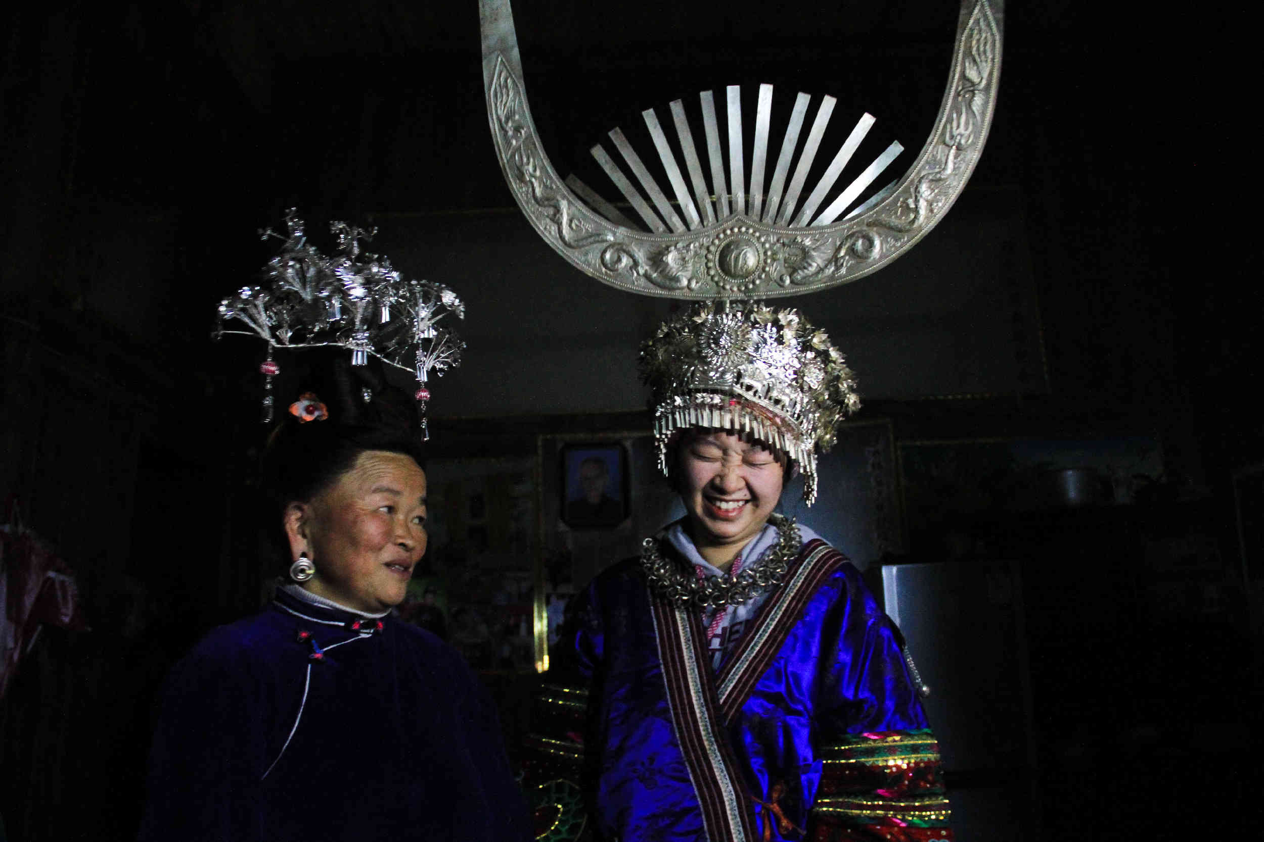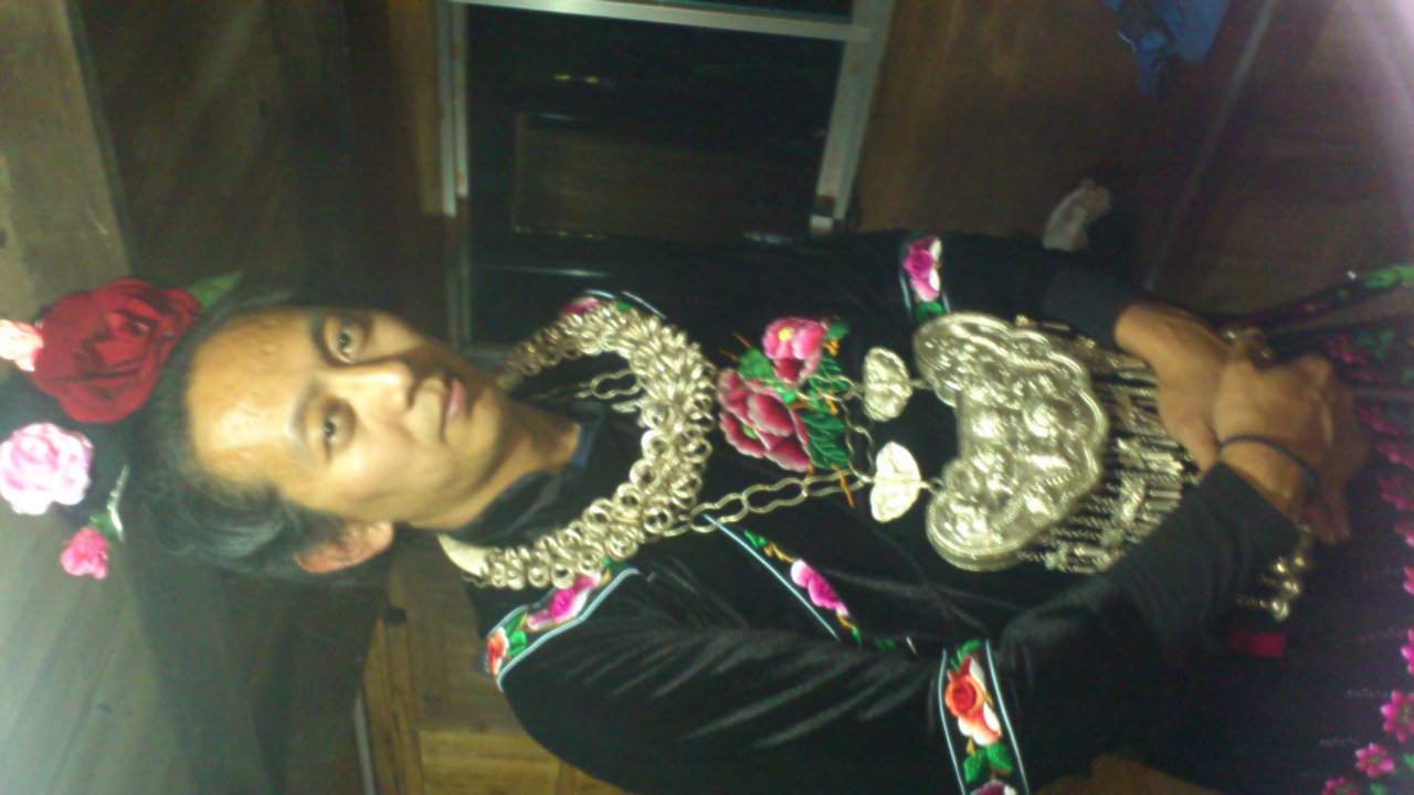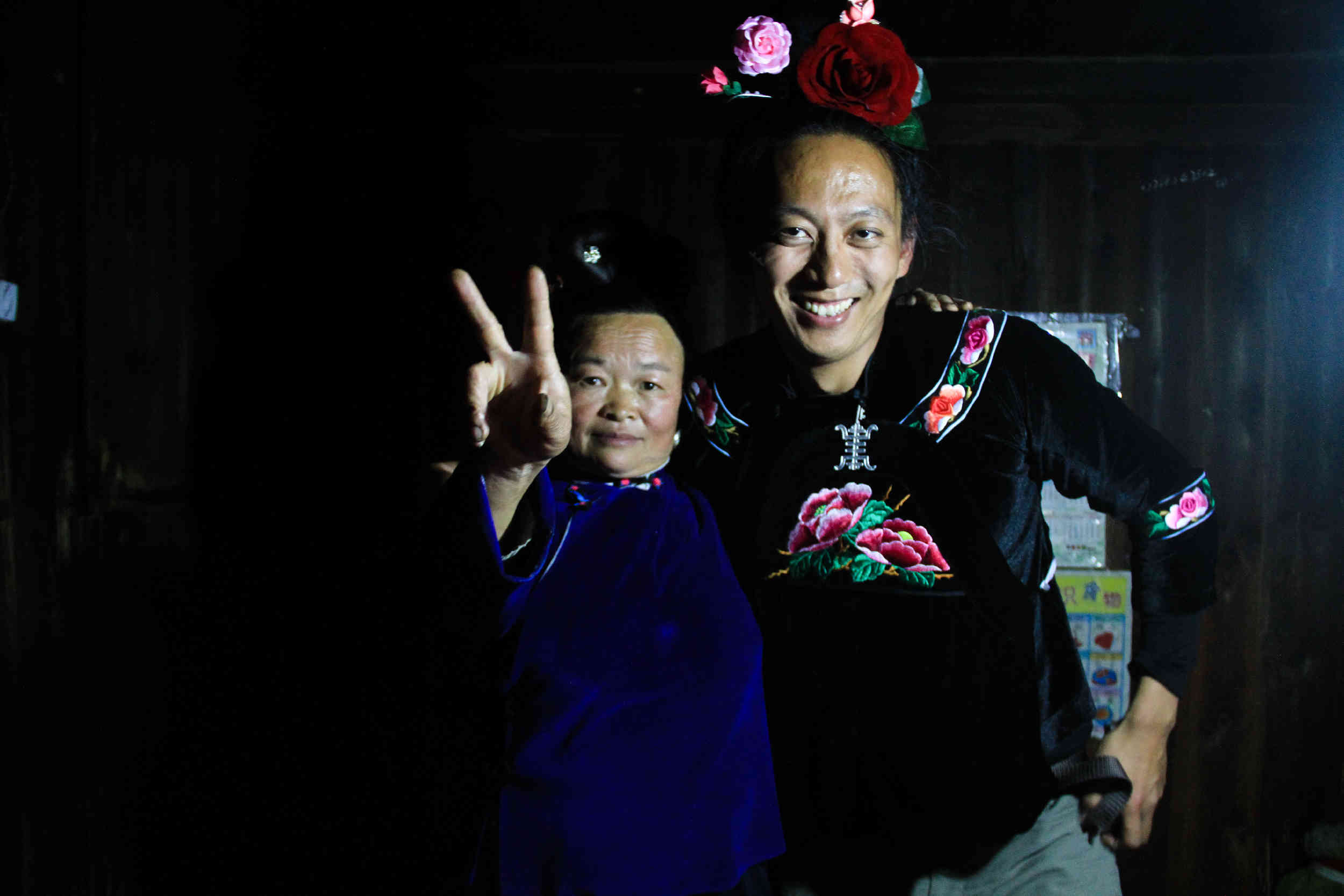 赵先生的母亲,一位苗族大妈,虽然年过五十五但调皮的像个小孩儿。饭后把她的苗装,假发和一大朵花都给我带上了,把黄姗打扮成要出嫁的大姑娘……正好快到万圣节了!