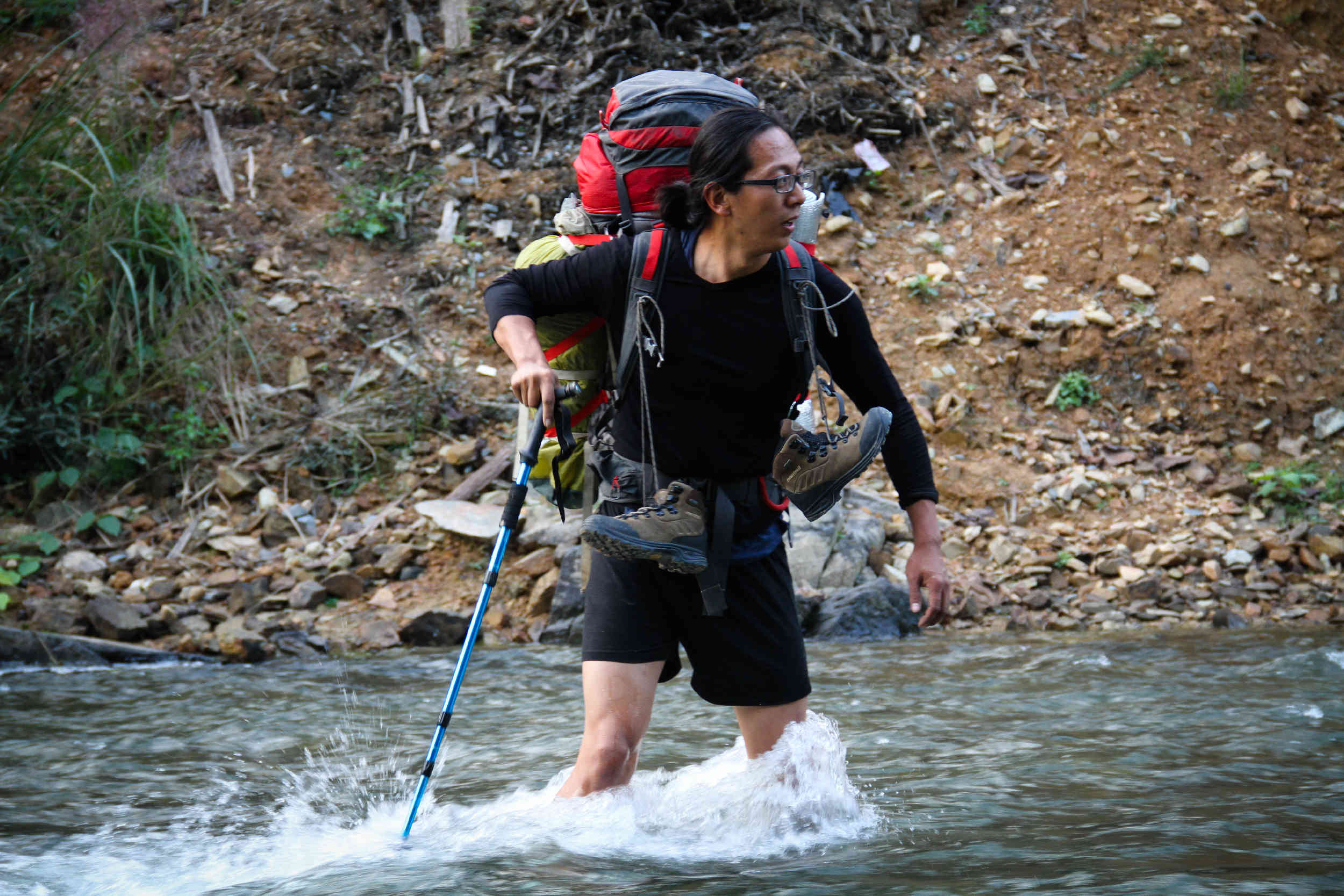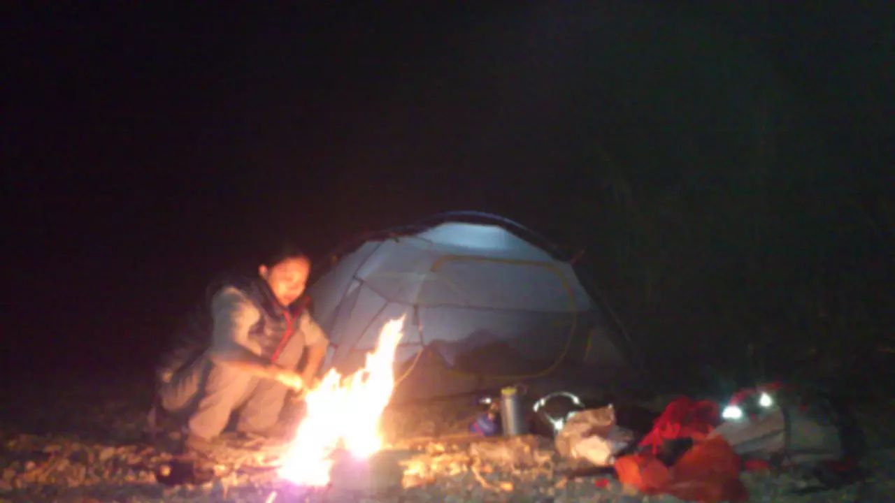 晚上我们从路边趟过一条河,在河边石头子沙滩扎营,起篝火。篝火快灭时,黄姗突然告诉我她看到两只绿色的眼睛在山坡上,吓得她抱着木棍往后退,”是不是狼呀?!“