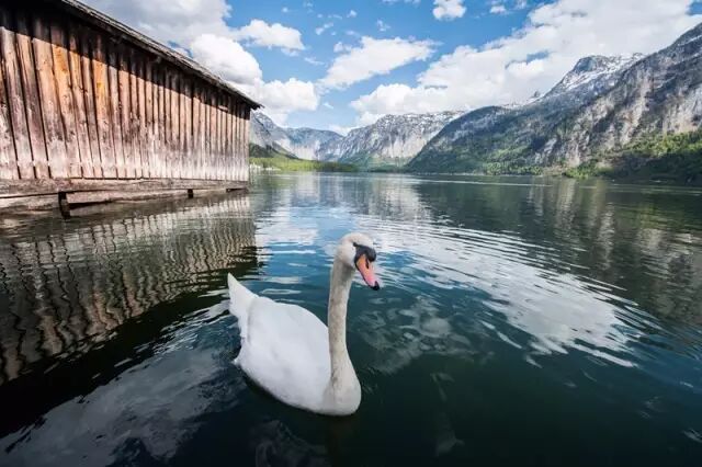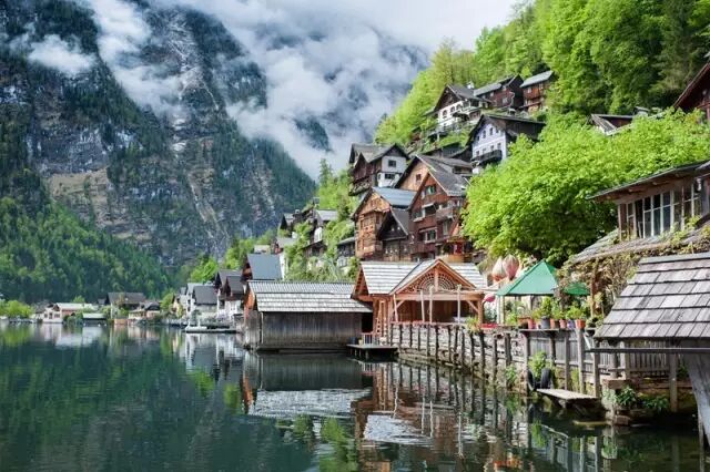 欧洲最美小镇,奥地利的哈尔施塔特。湖泊如镜,绿草青青,童话般的小屋,让人感觉如入仙境。