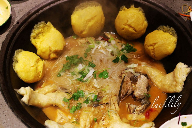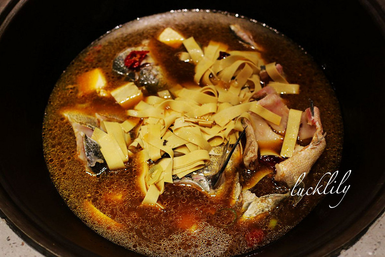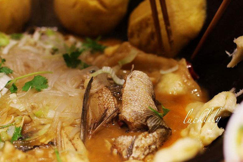 随着定时器叮的一声,服务员大哥来帮着揭开了锅盖,并且往里头迅速的下了粉条儿、葱花、香菜。大伙儿就齐刷刷的下筷了,我一向就爱吃鱼,这鱼确实好吃,融入了骨汤的味道确实让鱼肉的味感更是好吃。