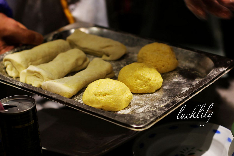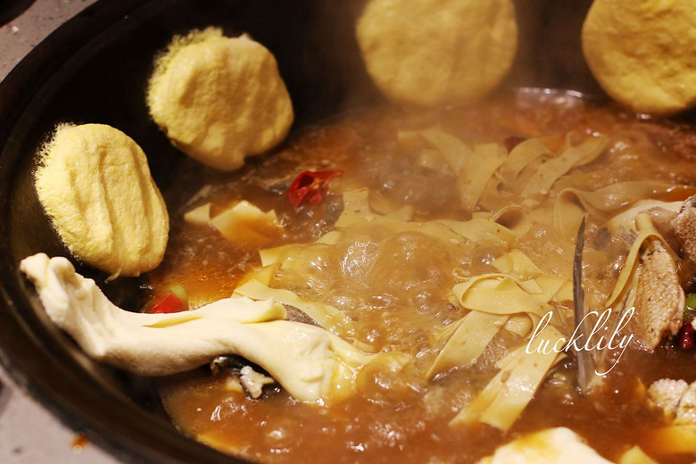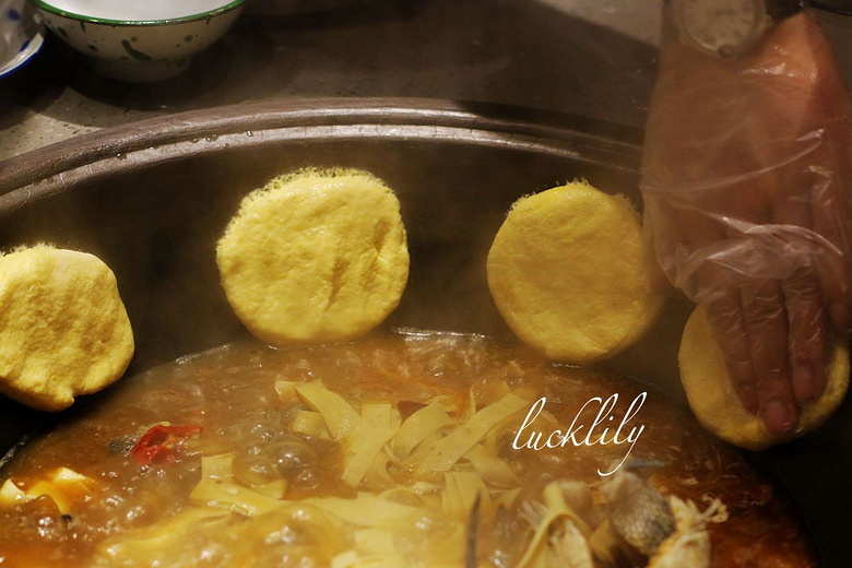 鱼和汤下锅之后,老板带着服务员大哥马上又端上来一大盘店内手工现制的玉米面和面筋,一块块一条条的粘在锅边,这是东北炖锅特有的美食搭档,利用煮鱼时 铁锅 传递上来的温度,还有鲜活落锅在骨汤中炖煮鱼儿时锅内的蒸汽将这些玉米面儿、面筋烹熟,自然是有一番独具的风味,我吃了之后更为喜欢面筋的味道,面筋带着 甜味,就着鱼汤吃外层又裹上鱼汤的鲜美,甚是好吃。