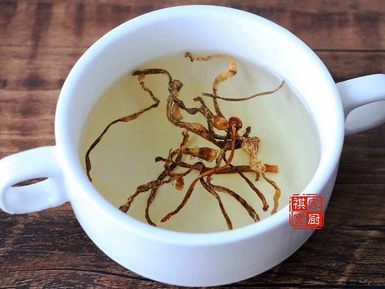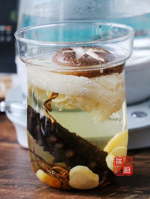 主要食材: 海参、竹荪、香菇、虫草花、瑶柱、枸杞;配料:适量的盐,(酒)、(胡椒粉)。