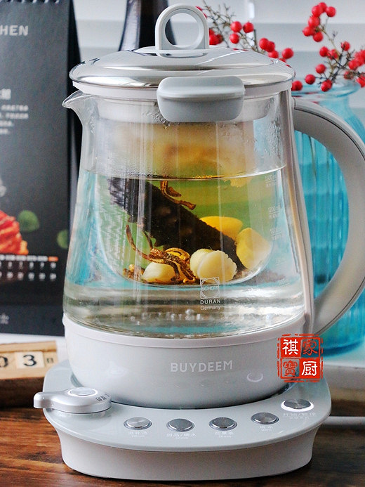 养生壶中加水至1000毫升,将炖盅安装好,启动“药膳”档,待自动断电后取炖盅,加入适量盐即可。