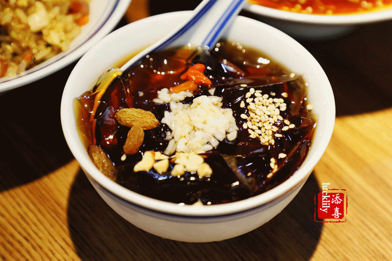 手工冰粉、水煮牛肉、麻辣鸭肫钯、冒千层肚、签手炒饭……还有豌豆杂酱面、红糖麻糍等,菜单上成都特色的小食很多,感觉每样都诱口水,其中我一向都最爱吃的是鸭肫钯,位于鸭胗和鸭食带直接的位置,又名鸭郡把,口感比鸭胗要脆爽,又比鸭肠更有嚼劲儿,与麻辣的味道是绝配;签手炒饭是服务生推荐的招牌,品尝了一下,果然炒的颗粒分明,一勺入口,溢齿留香。