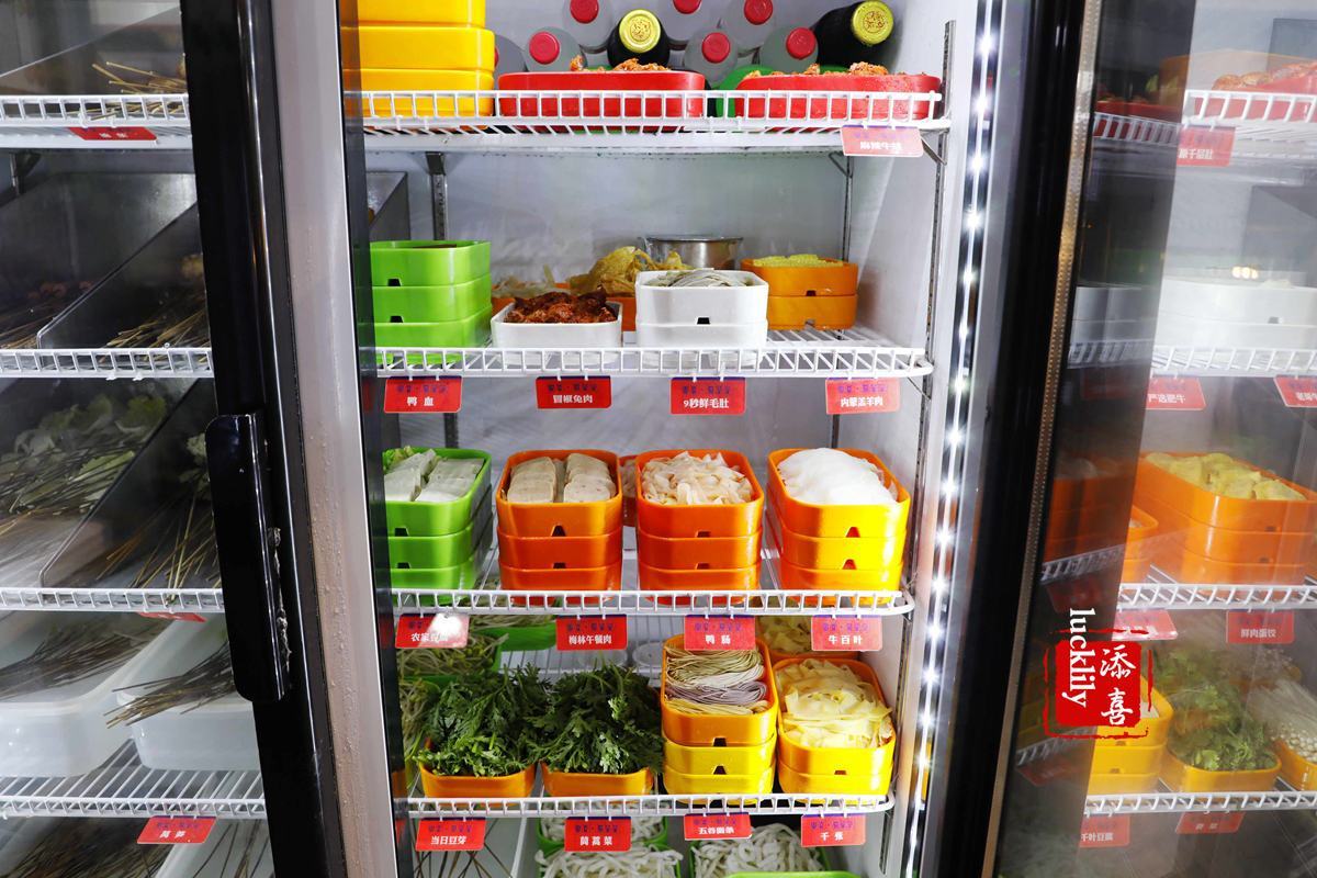 几台大玻璃冰柜中分门别类整齐的码放着各种荤素串串和盘装的火锅菜,单品的份量都挺足实。