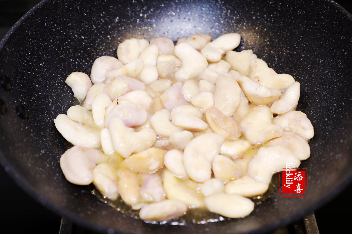 将嫩菱倒进去,翻炒一下,加入少量的清水煮一会儿,时间可略长略短,菱生食也是水果,煮的久口感会粉实一些,煮的时间短口感生脆一些。