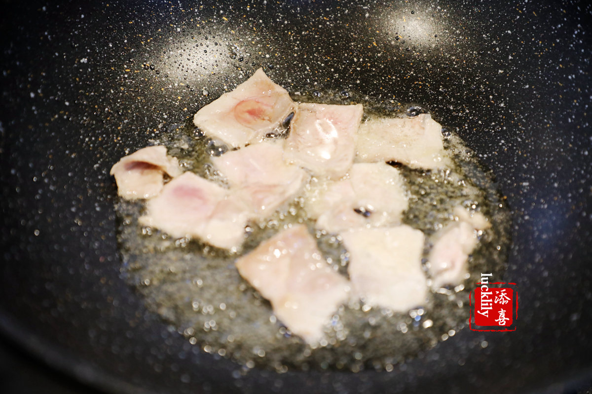起个油锅,其实可以不放肉,清炒也很好吃,不过这不肉贵了么,贵了就感觉精贵,加一点出个肉汁味儿搭一下。