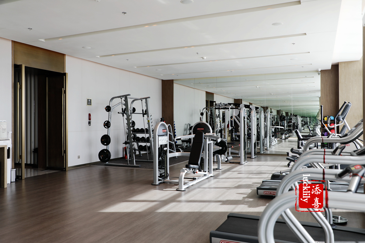 酒店6层的健身及休闲娱乐区域,健身房内配置了全新进口的专业健身设施,跑步机、太空漫步机、登山机、靠背式健身车等,一应俱全。