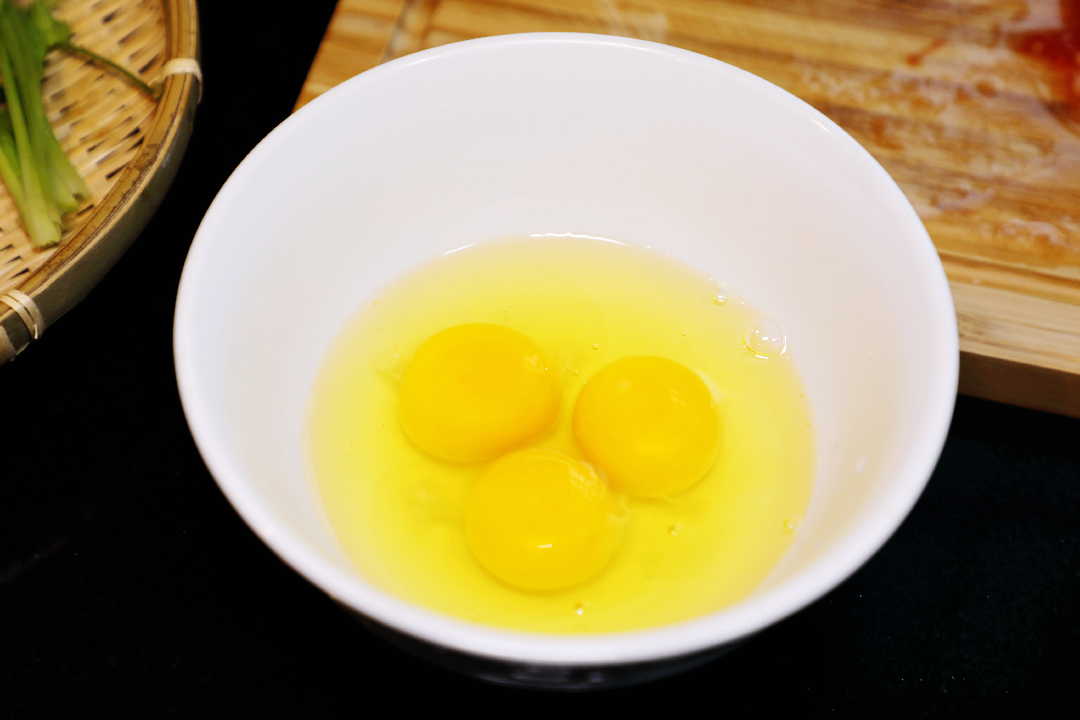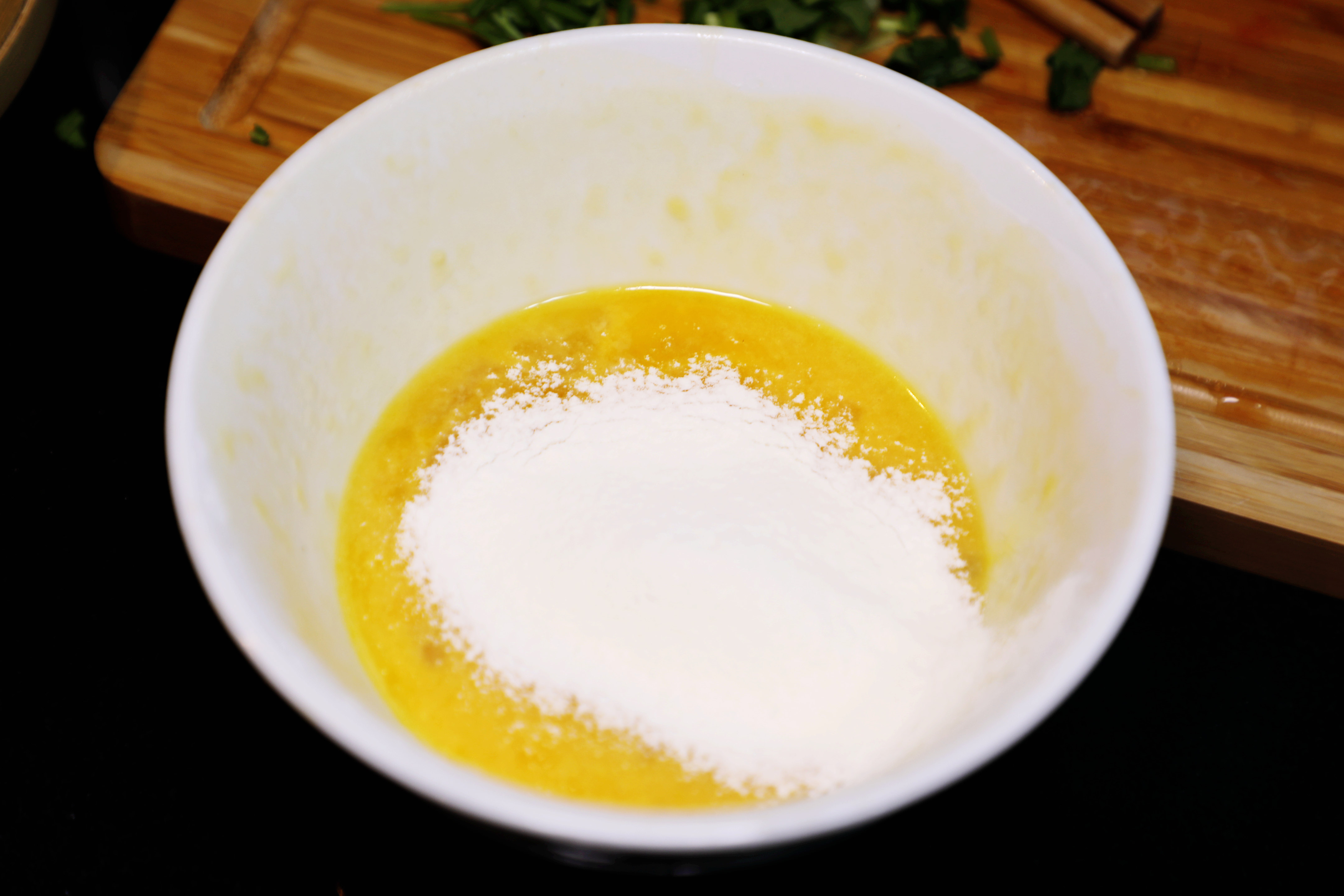4、鸡蛋中加入微量的食盐、淋入些许料酒,打散;