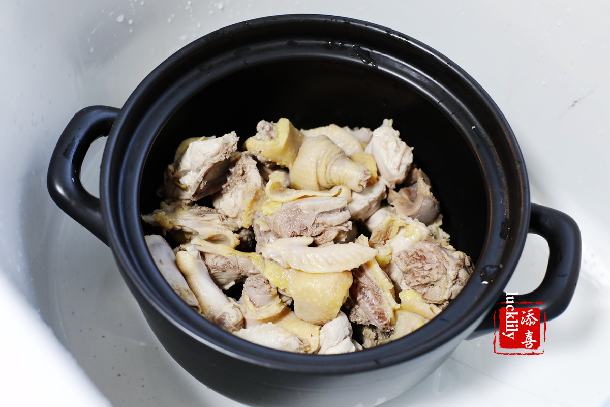 将锅也清洗干净后,重新将鸡块放入砂锅中。