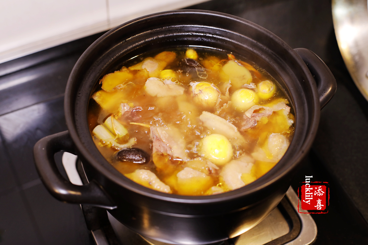 在60分钟左右,开锅加入鸡腹中取出的鸡蛋,再煮30分钟后开锅加入适量食盐。