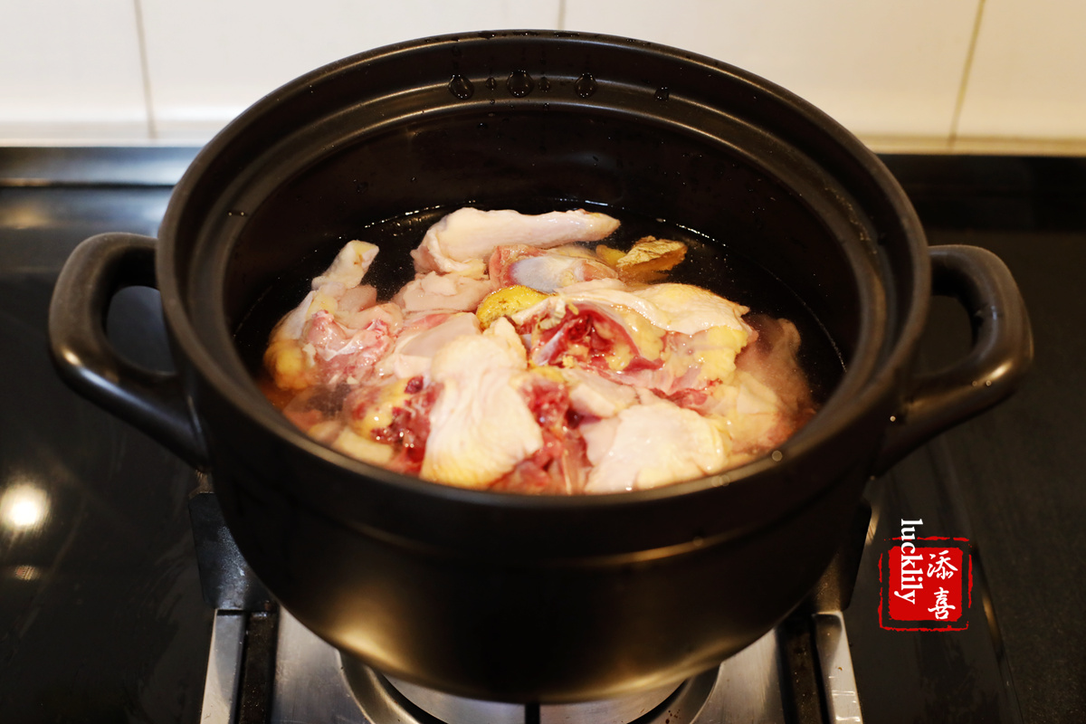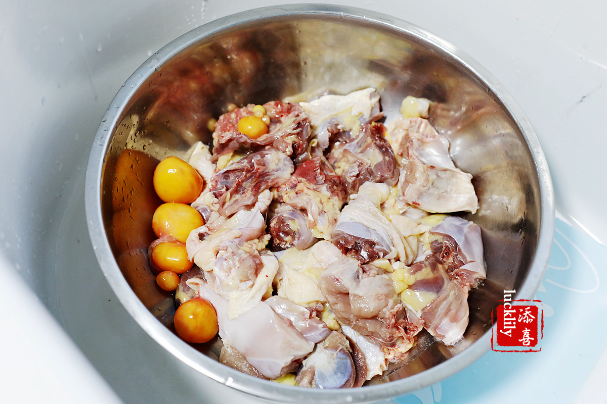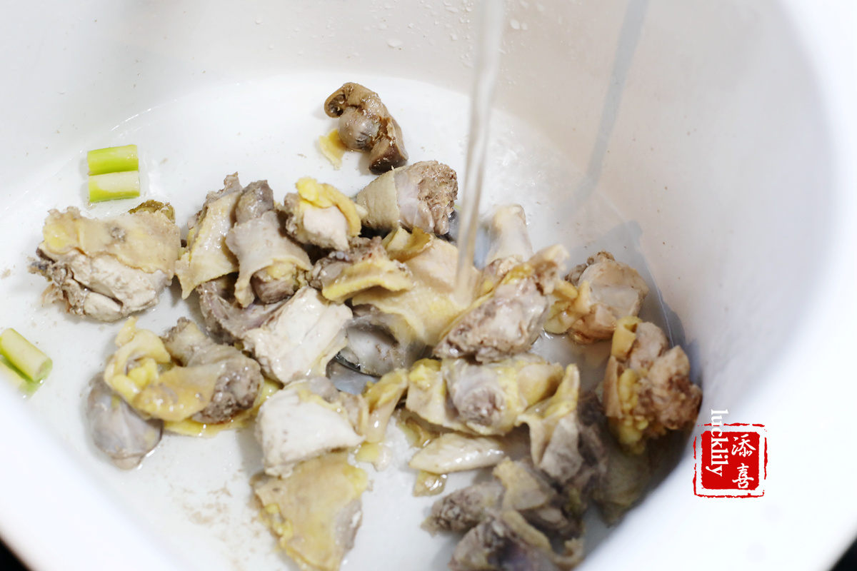 一煮沸,轻搅一下鸡块,即关火,将鸡块倒入水池中,用清水淋法,却除浮沫。