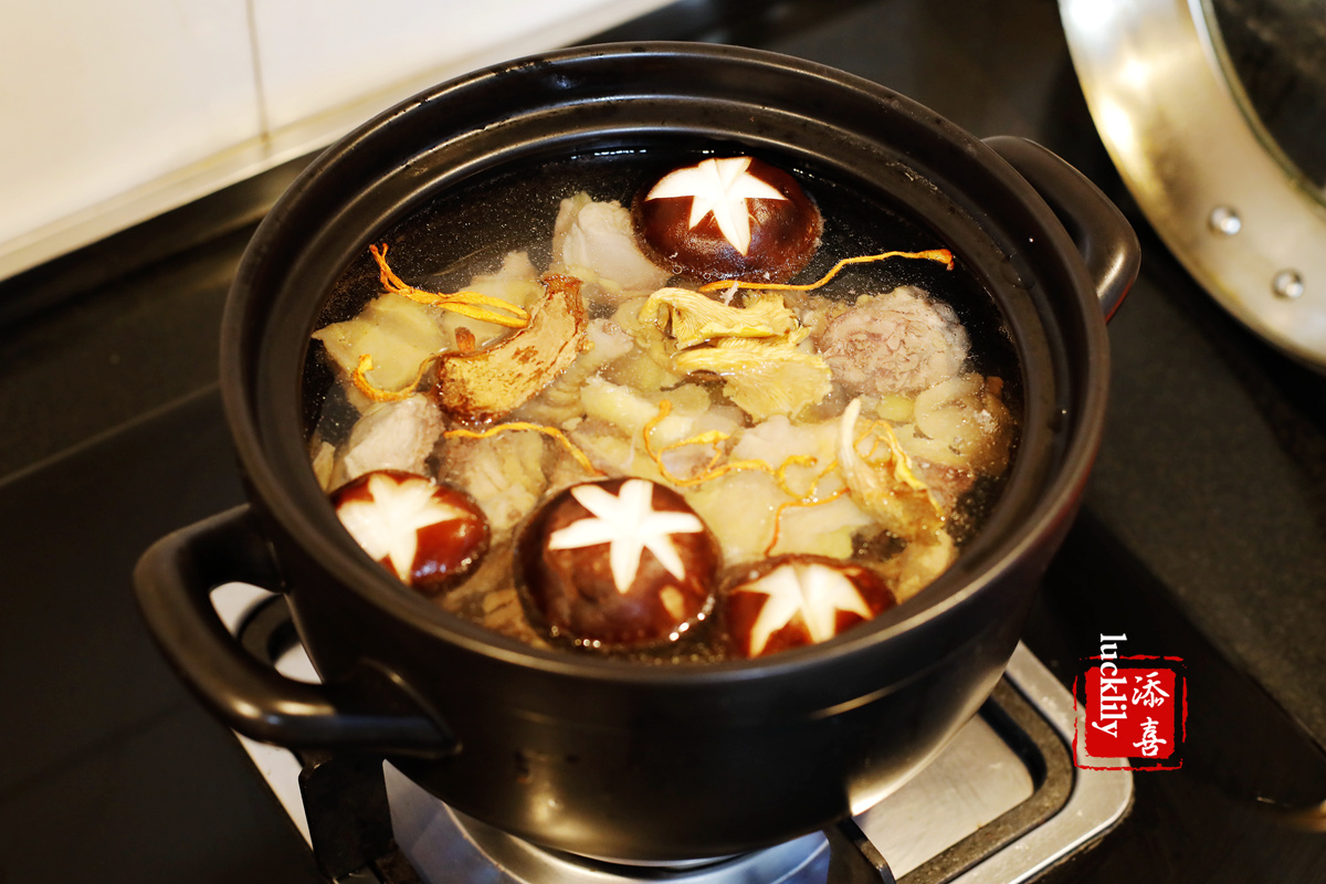 放入姜片、香菇、虫草花、鹿耳菌、北风菌、长寿菇、牛肝菌等料,加入料酒;