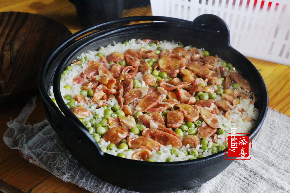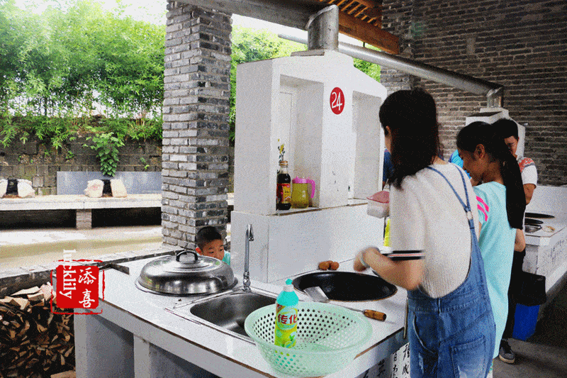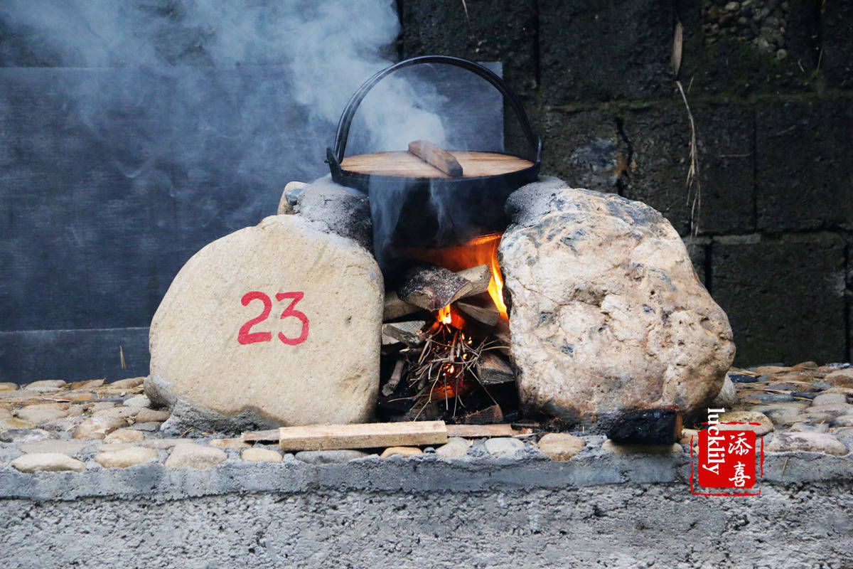 一天玩下来,两顿饭都可以在景区内自己做,中午时间短,可以来“天下第一锅“预约煮上一锅腊味饭,这时节快到了端午了,吃豌豆腊肉饭正是时令,石头砌的灶