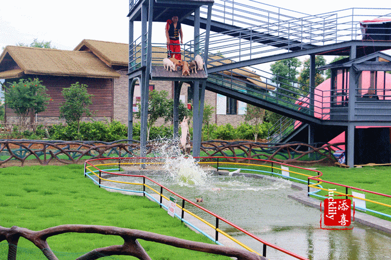 在田园嘉乐比乐园里小猪都赶上奥运跳水啦,一只只灵动的猪猪生龙活虎,三米跳台它们争先恐后的一跃而下,丝毫没有半点犹豫。每天都会有小动物们耍上些小杂技,引人注目,这一场演出也千万不要错过,小丑会在热场的时候跟小朋友互动,现场派发礼物,整场演出高潮迭起,超级精彩!