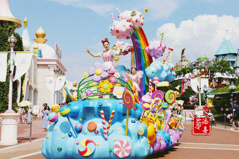 型逼真、趣味十足的花车组成声势浩大的花车车队,在载歌载舞的童画人物引领下,在特定地点停留表演,与游客问好、嬉戏、拍照合影。夏天到了,他们还带上水雾枪,逼真的象打水仗一样,把清凉送给跟随的观众们!同时,乐园所有的精灵都会出现,够幸运的话,你还会被邀请上花生,做一回粉红童话里的主角呢!