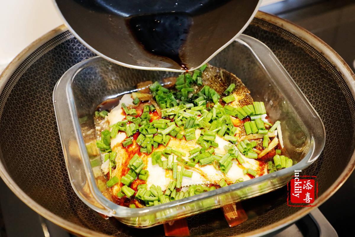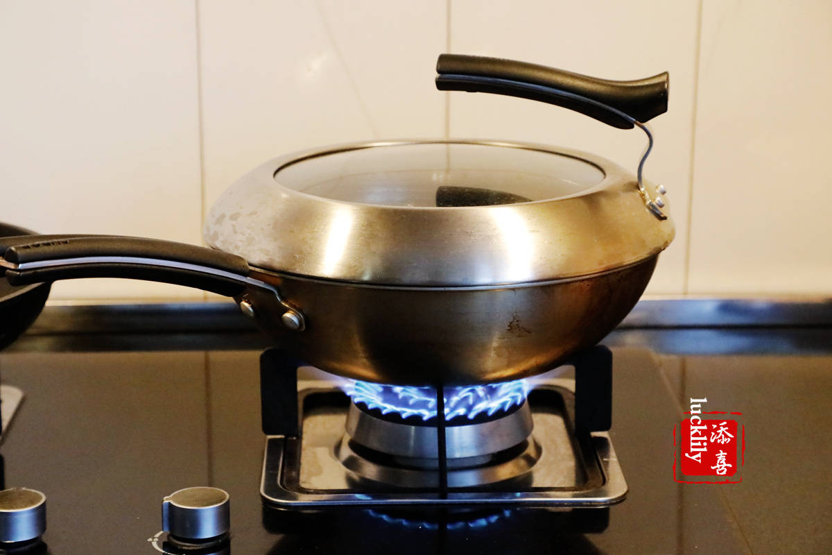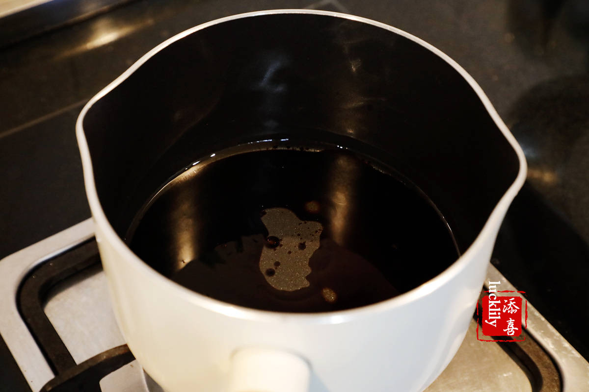 同时我在边上的小锅里倒上食用油、鲜味汁、生抽,加入几粒小米椒段儿,煮沸;