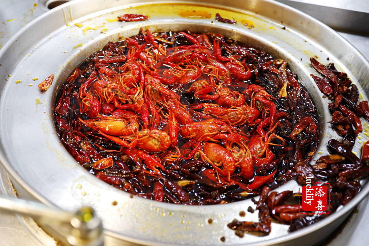 开放式厨房,清清爽爽,厨师们在现场加工小龙虾,外卖小哥在一边排着队。