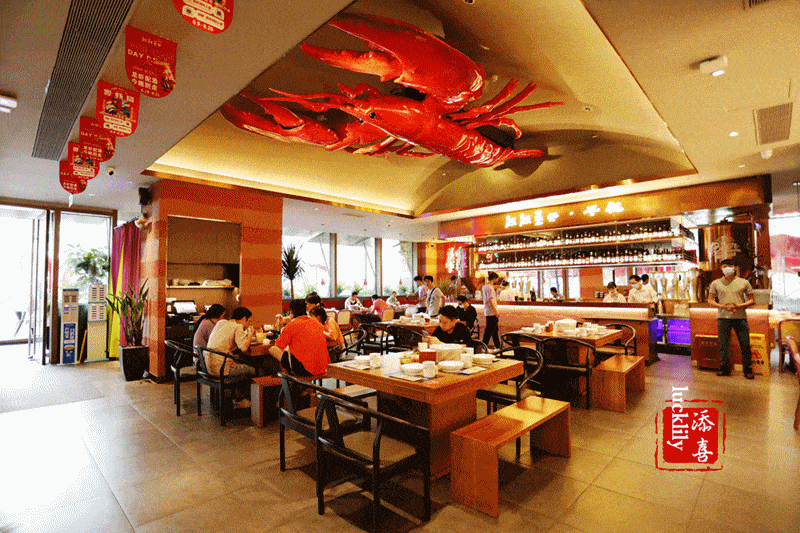 录过《天天向上》、上过《新闻联播》,12年开遍了全国43家店的靓靓蒸虾,餐厅的设计风格很潮,尤其是餐厅中央吊顶上那只霸气威武的大龙虾超有气势!