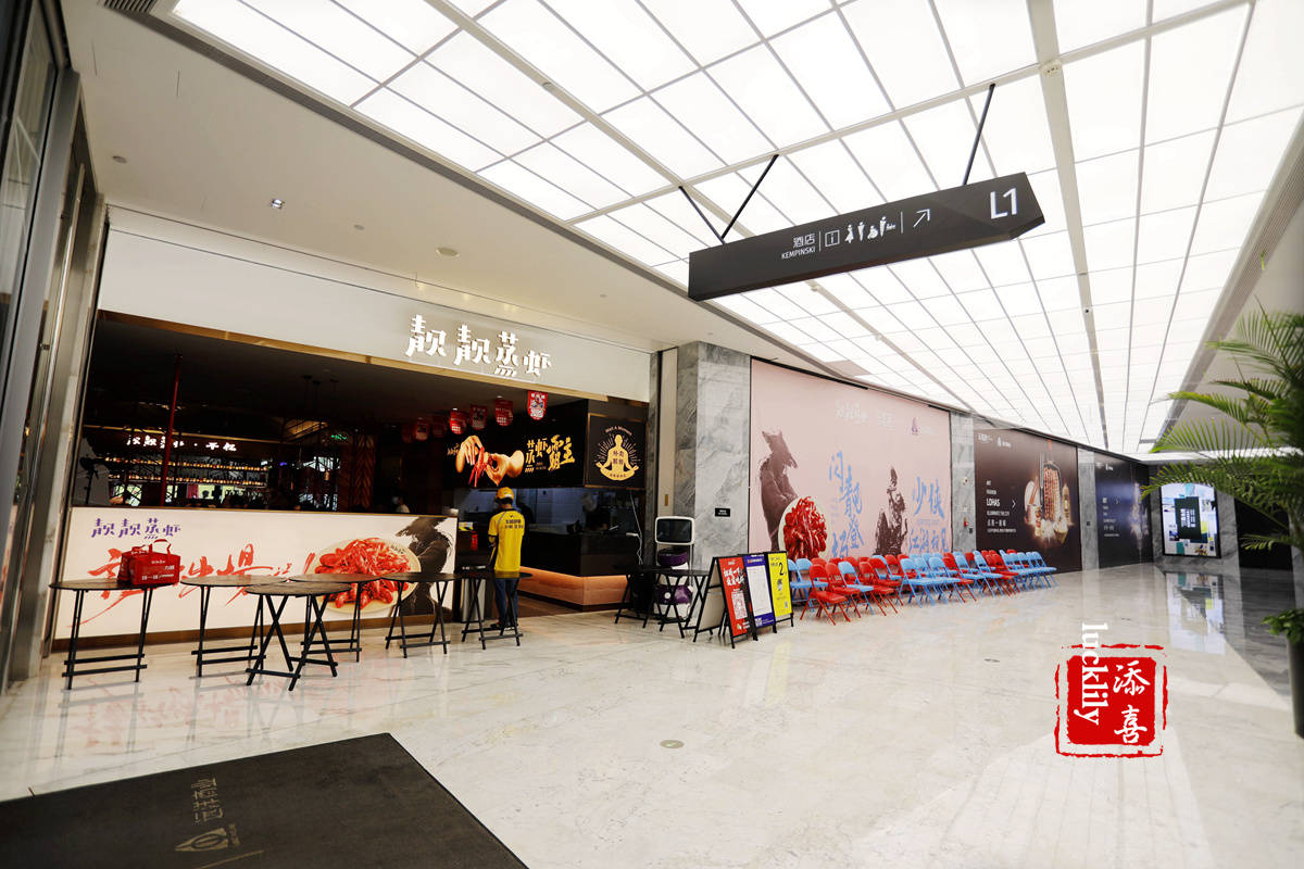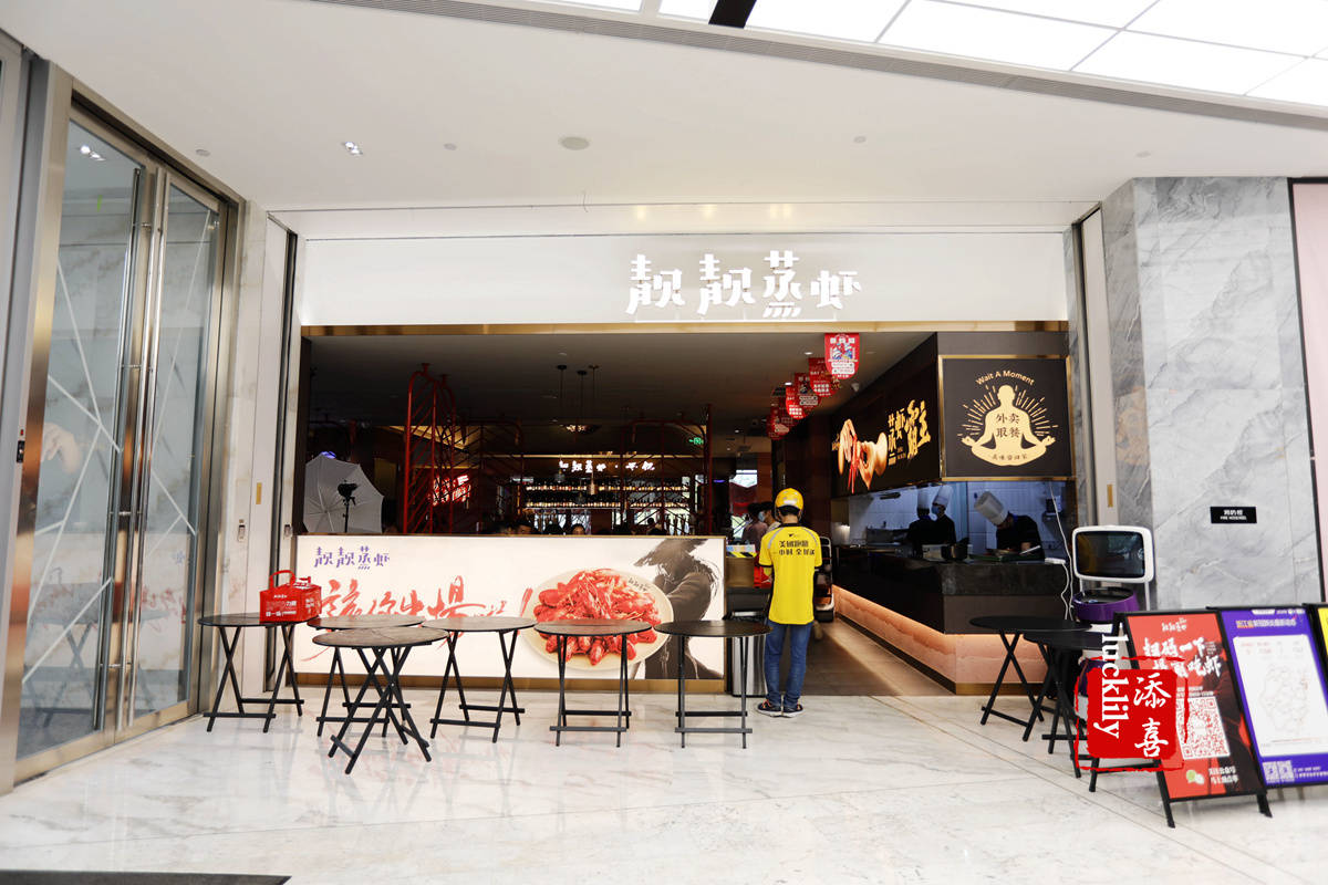 杭城首家“靓靓蒸虾”位于远洋乐堤港一楼,因为是自驾停车在地下车库,顺着指向牌上来,所以其实我走的这个是侧门,正门是面朝乐堤港中心广场的,餐厅门口还有可容纳百人的宽敞露天席位。