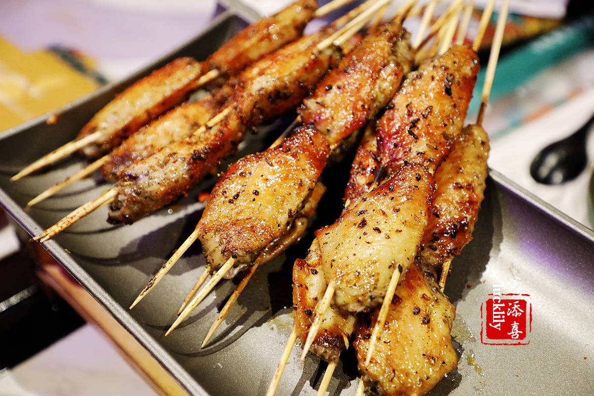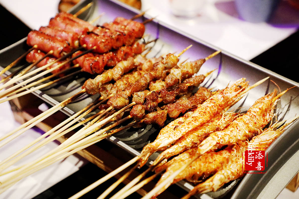 烤串的品种非常多,服务生会给桌上放上一个炉盘,然后依次送来烤串,这样烤串的就能一直保持着温度,培根卷、掌中宝、大虾、羊肉串、青柠鸡翅、面包、吐司……每样都烤制的相当诱人。