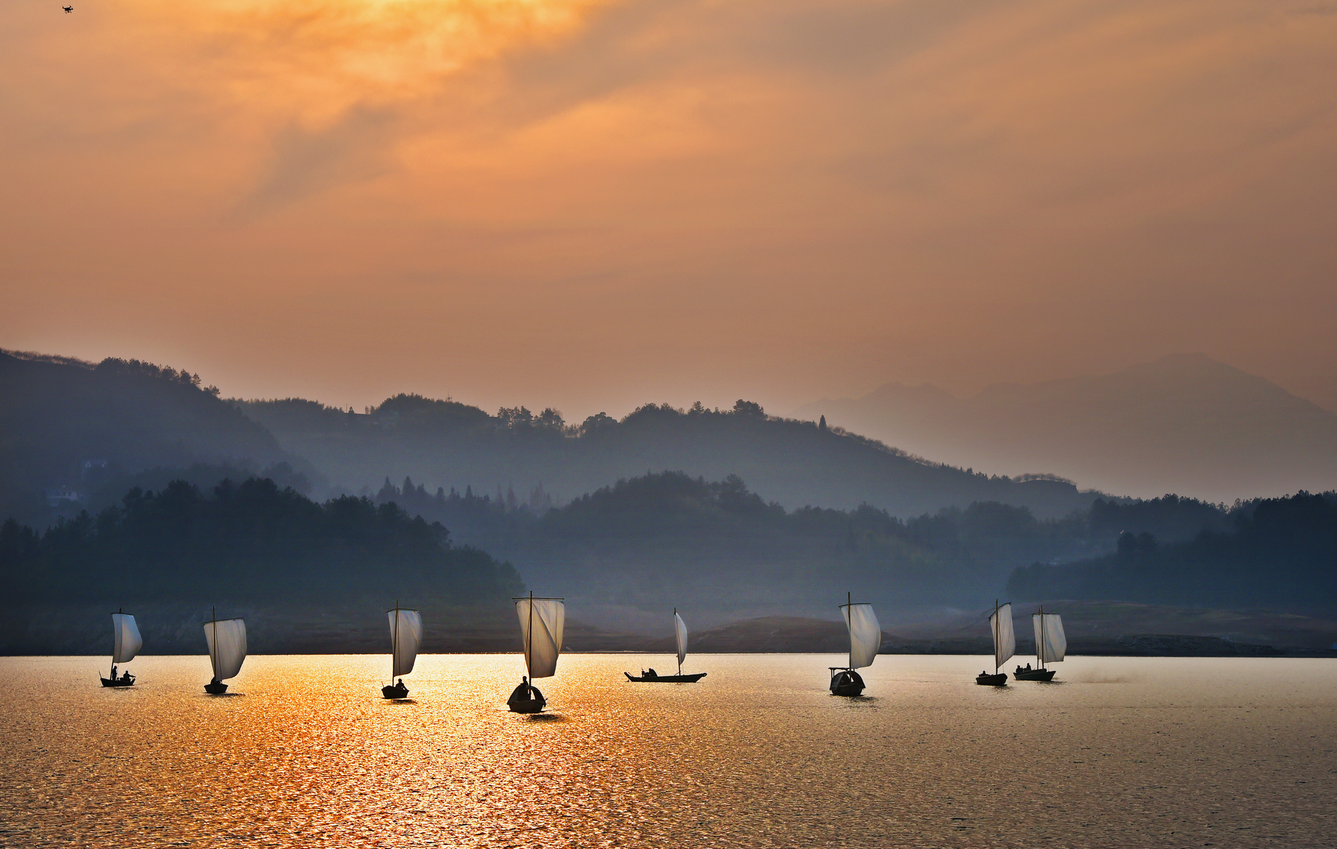 冬日,清晨的乌溪江,弥漫着一层淡淡的白雾,在微风的吹拂中,丝丝缕缕地飘逸在空中,如黑白帷幕隐隐约约。江从两山相夹的缝隙中,缓缓而来慢慢宽阔,轻纱似的薄雾中,远远地飘来了点点白帆,给宁静的江面,划开了道道犁痕。