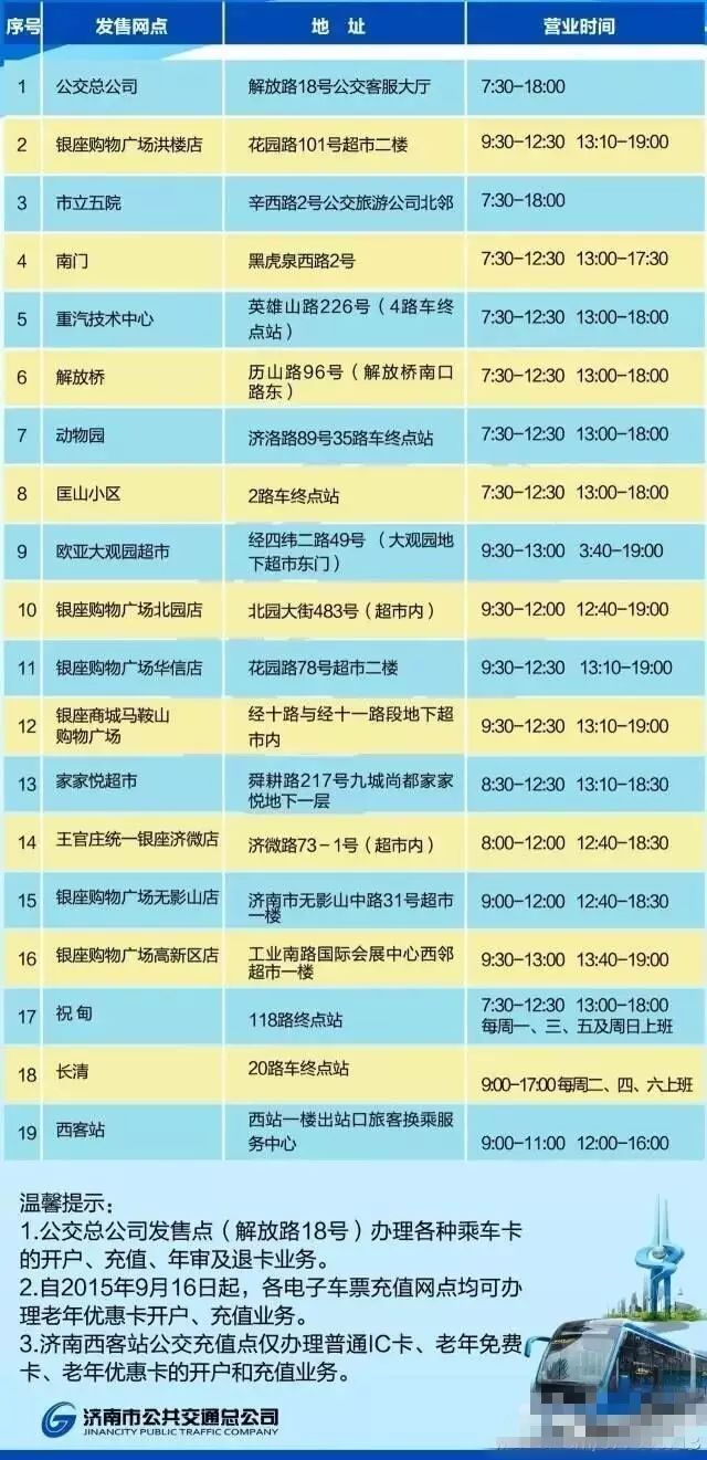 济南公交卡充值点及营业时间都在这了,分享给大家。收藏吧,万一用到呢?