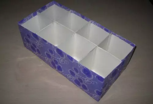 接下来将准备好的硬纸板对比好纸盒的宽度,用剪刀裁剪出隔板,按照自己的需求剪出不同块数隔开,放置的时候就把另一个纸板插上去即可,为了美观也可以将我们的纸板包装一下。