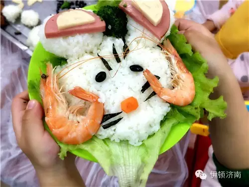 美食教室里的工作桌上,提供了让孩子能自己DIY的简易食材,米饭、海苔、生菜叶、大虾……孩子在老师的指导下,正在制作可爱的卡通便当。