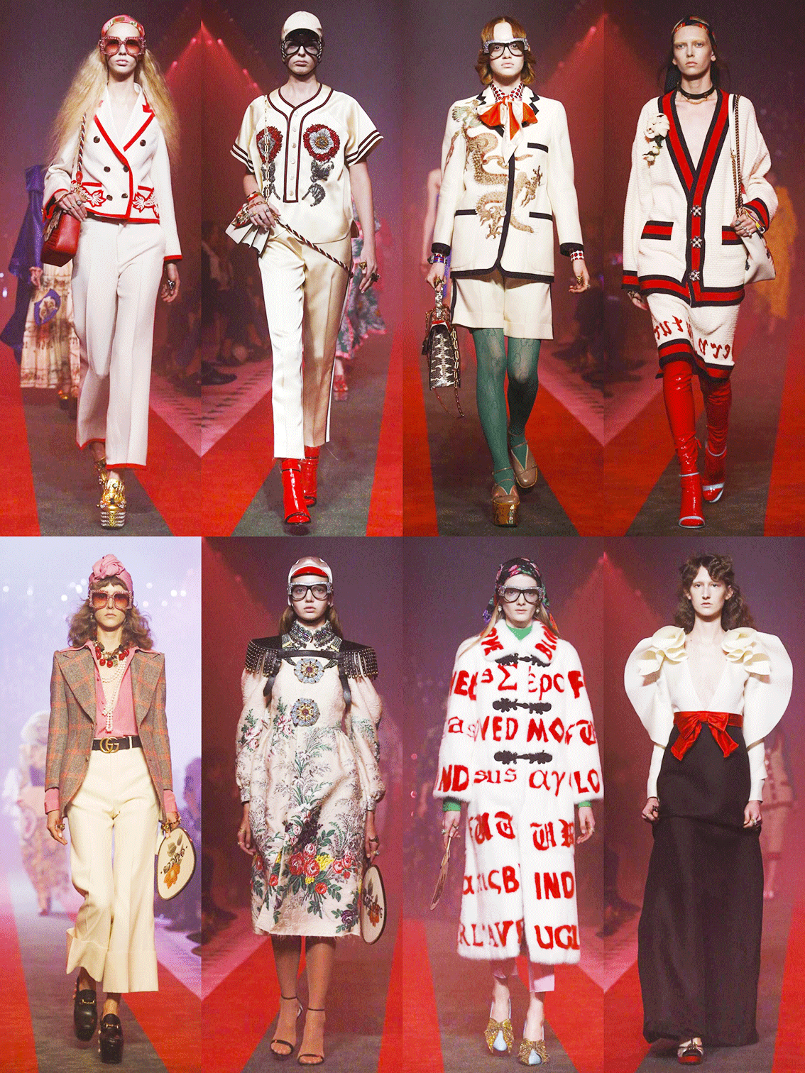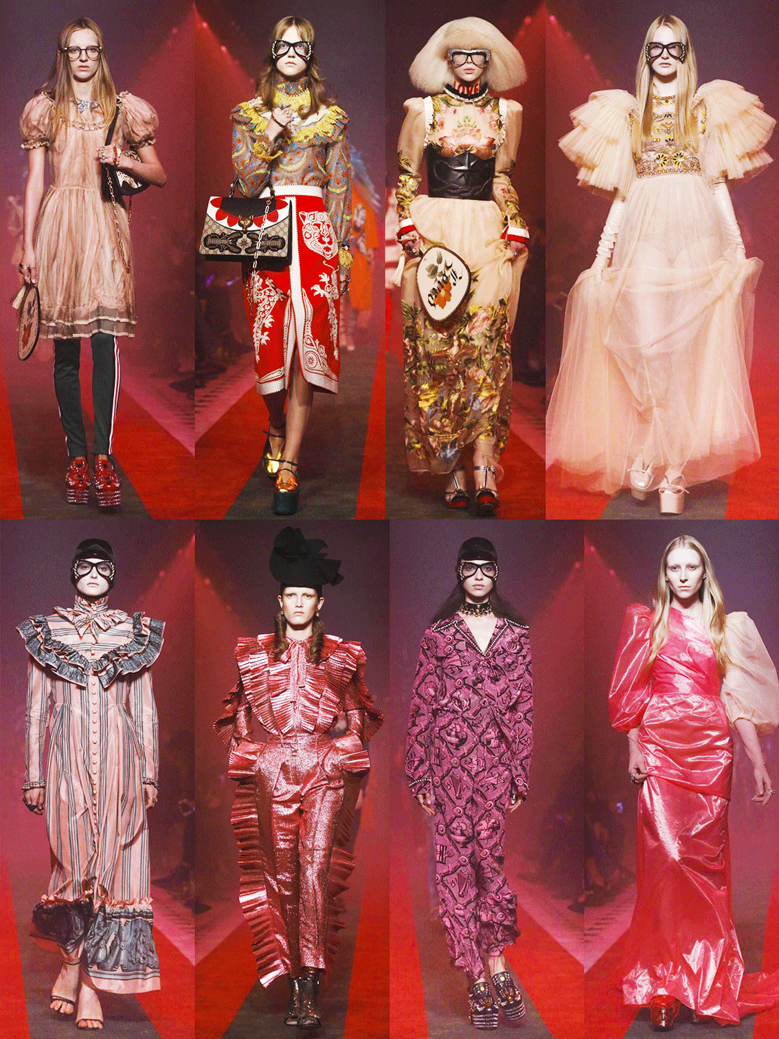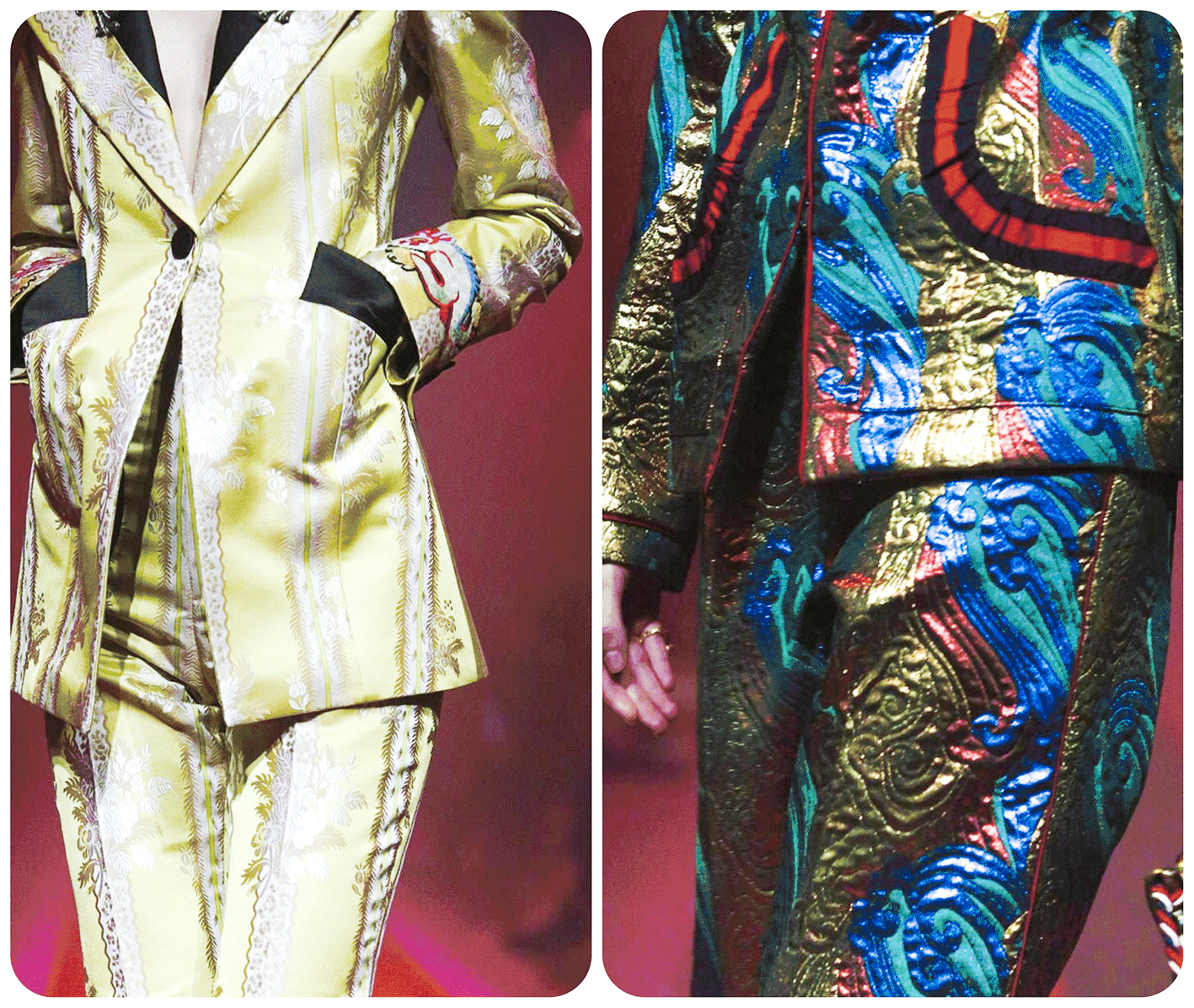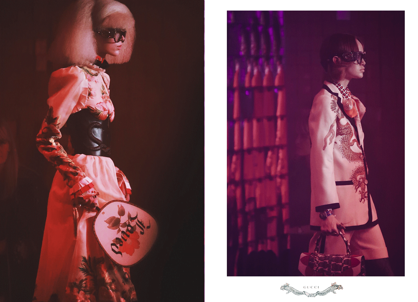 Alessandro Michele在探索异域风情的道路上渐行渐远,欧洲文艺复兴服装范式、中国古典清宫服饰元素、甚至是现代服装廓形和设计细节都大杂烩般丰富地呈现在这一季的Gucci女装系列中。