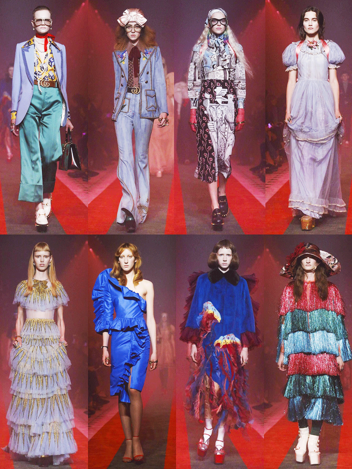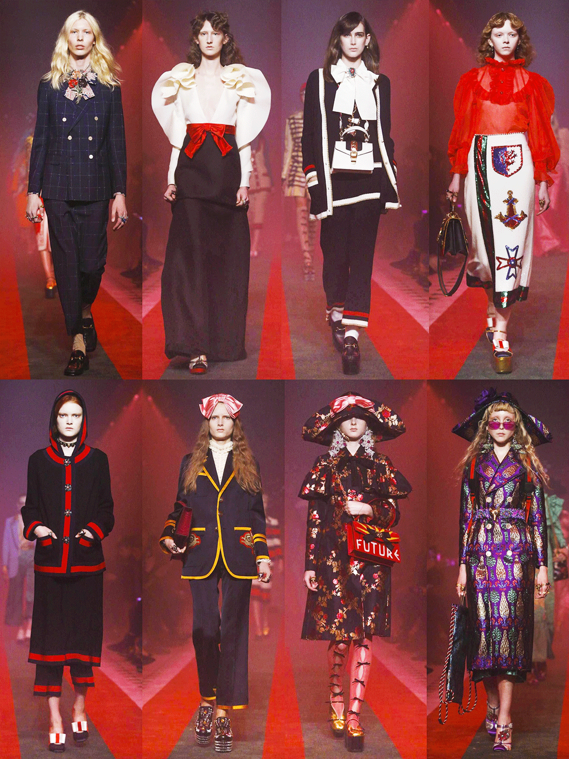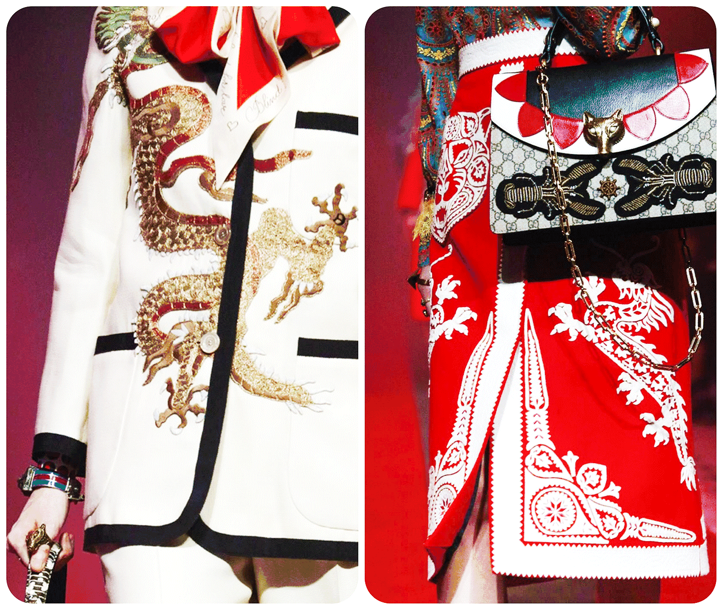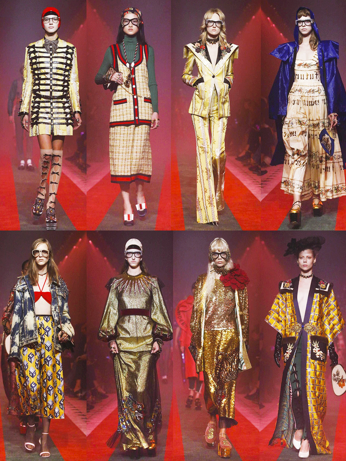Alessandro Michele在探索异域风情的道路上渐行渐远,欧洲文艺复兴服装范式、中国古典清宫服饰元素、甚至是现代服装廓形和设计细节都大杂烩般丰富地呈现在这一季的Gucci女装系列中。
