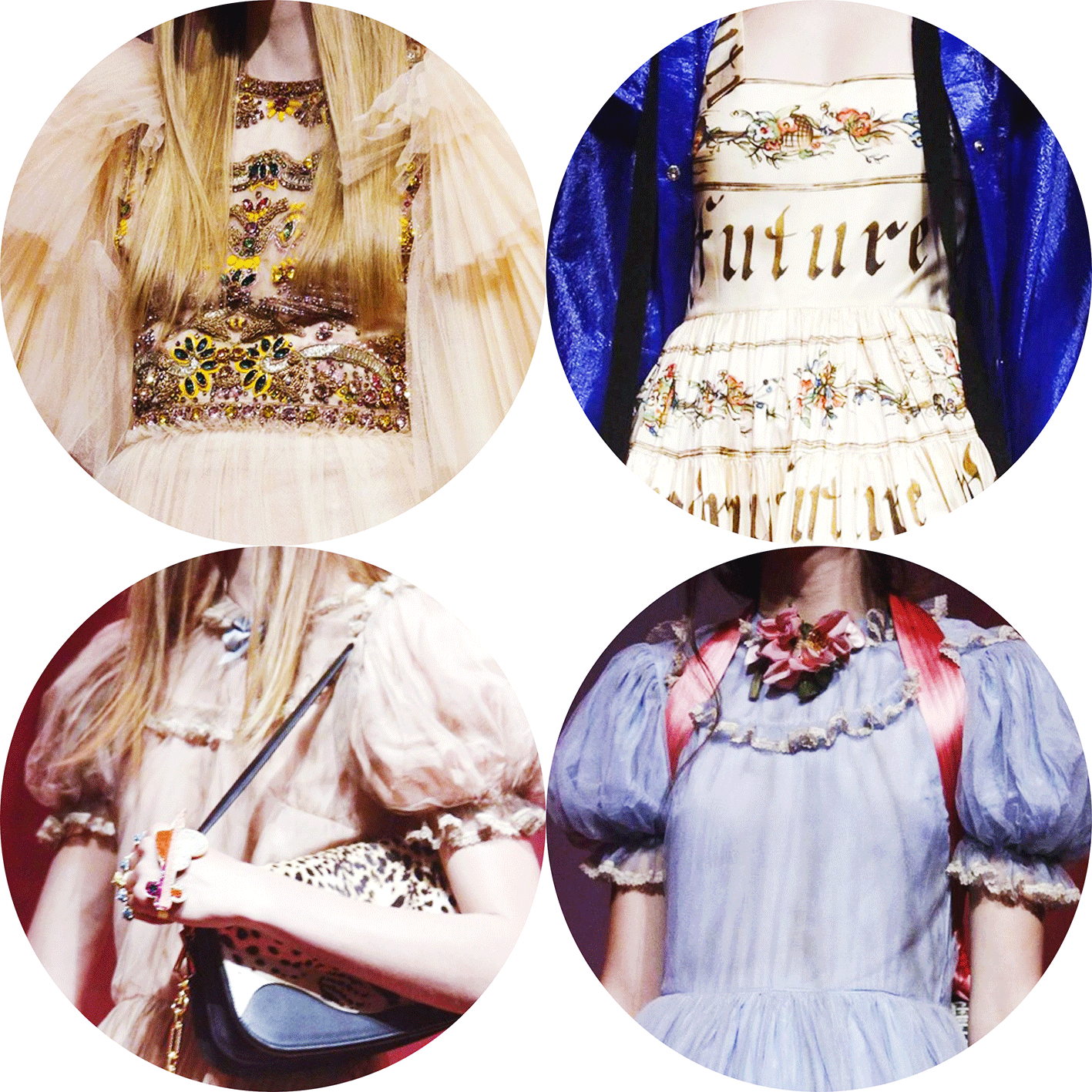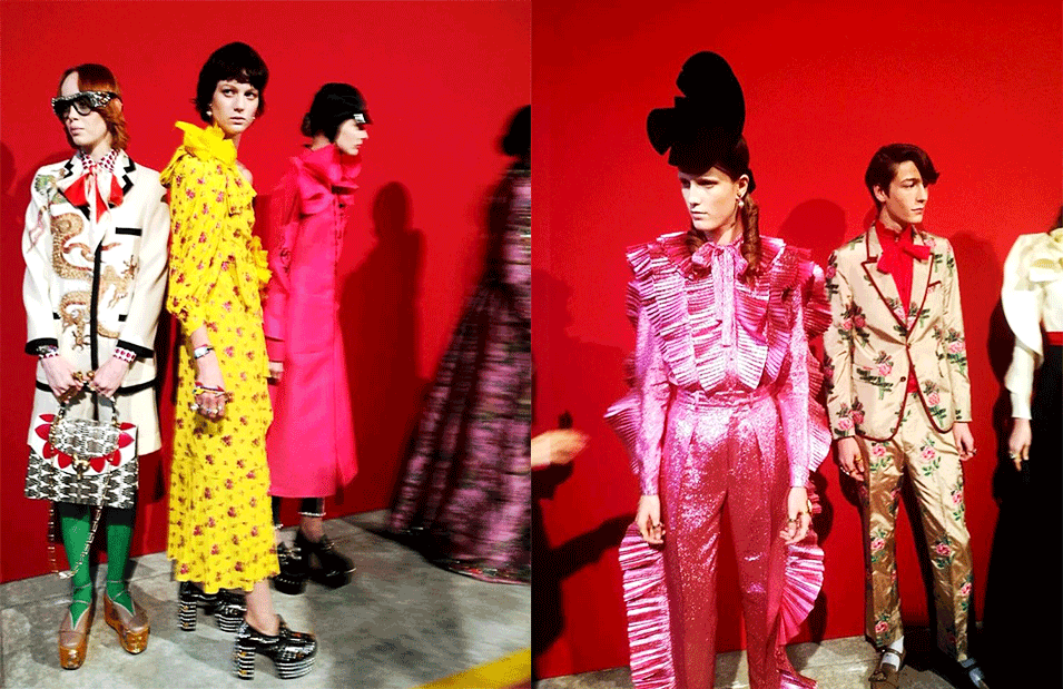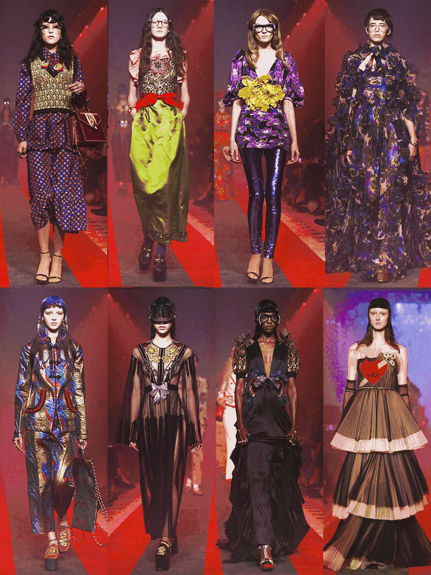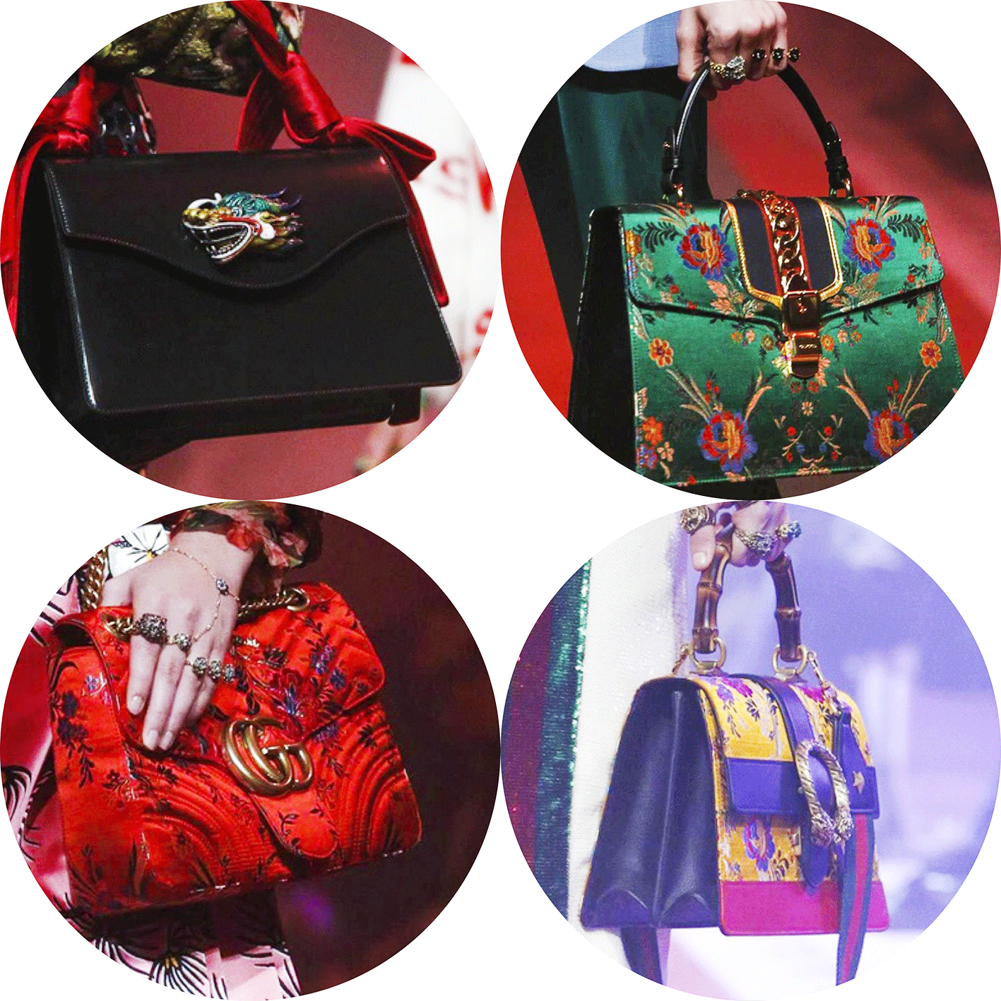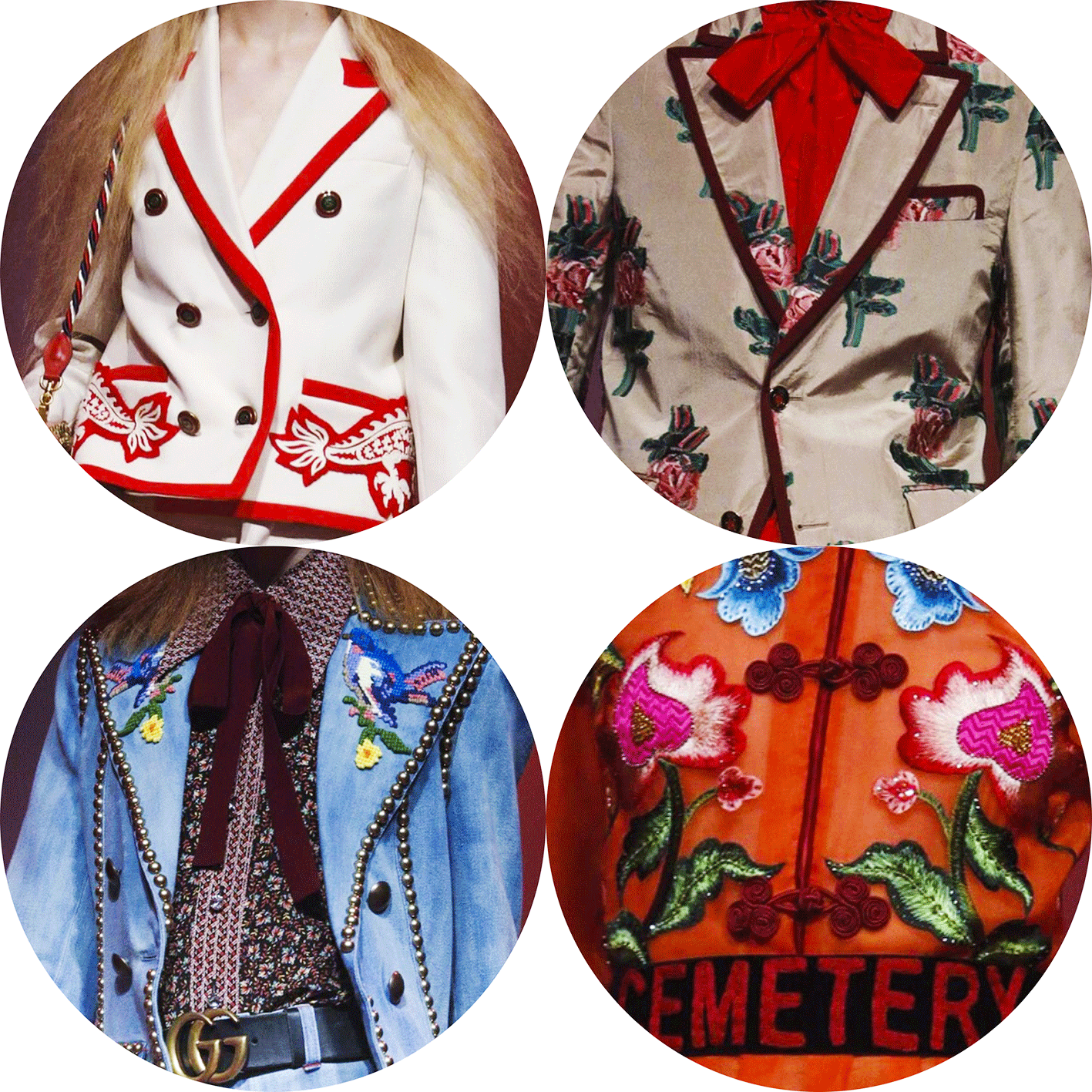 Alessandro Michele在探索异域风情的道路上渐行渐远,欧洲文艺复兴服装范式、中国古典清宫服饰元素、甚至是现代服装廓形和设计细节都大杂烩般丰富地呈现在这一季的Gucci女装系列中。