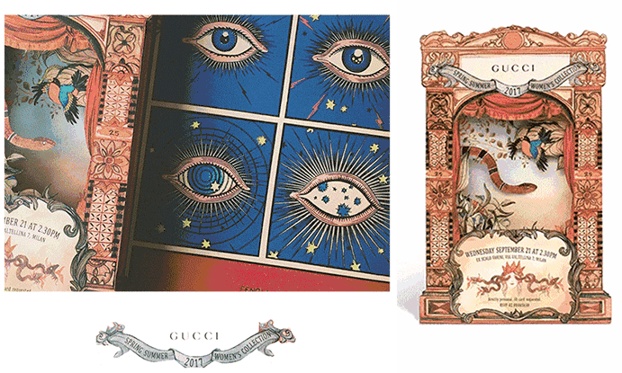 用卡纸做的3D立体影院邀请函贯彻着“奇幻投影”的主题。灵蛇与花鸟仍然延续着往季的文艺复兴的气息,星空和眼睛则代表着向外探索与发现。