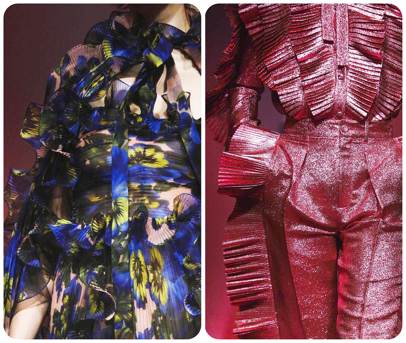 这一季的异域风专注于从中国宫廷服饰中汲取灵感,不像往季里仅是几个中式盘扣或者几块龙凤绣片那么敷衍和表面,中式服装廓形、团扇、花盆底高跟鞋、大面积中式花卉刺绣,这场中国风刮得好猛烈。