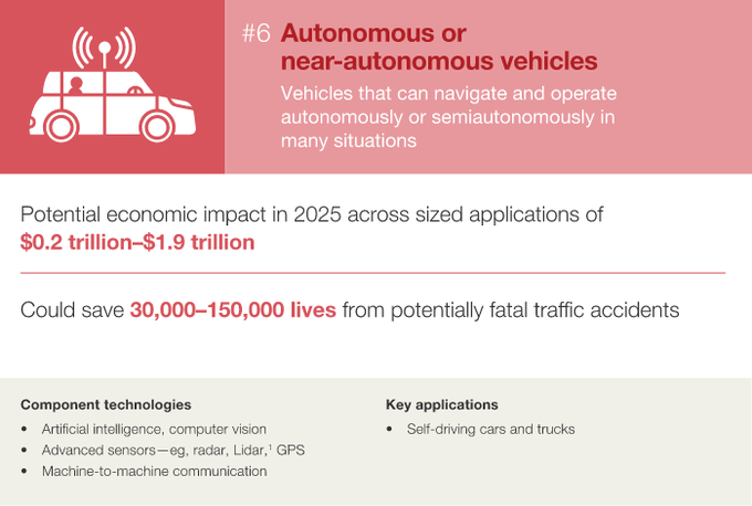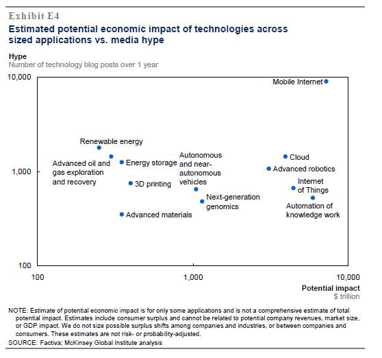 不过麦肯锡公司的报告中令人感兴趣的预测是,一些比较性感的新潮技术,如无人驾驶汽车、3D打印、可再生能源等的经济影响相对较低。