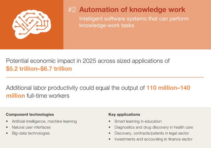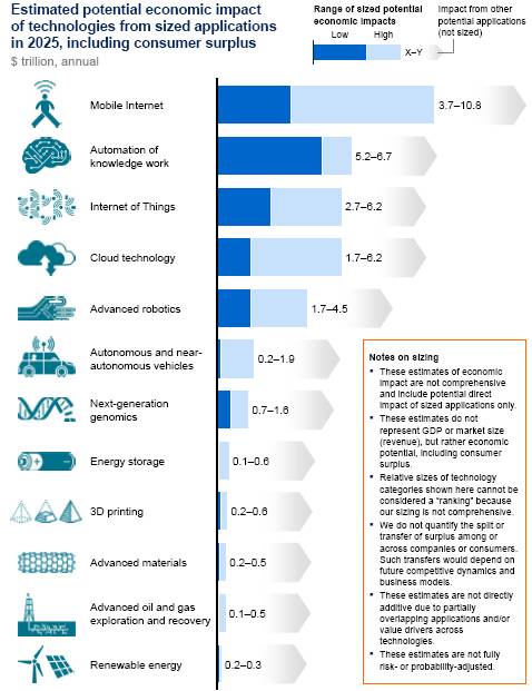 麦肯锡报告列举的颠覆性技术及其潜在的经济影响程度(含消费者盈余在内,即消费者并未支付的因创新而获得的价值),当然,这种影响评估只是粗略的,不会像GDP数字那么具体。
