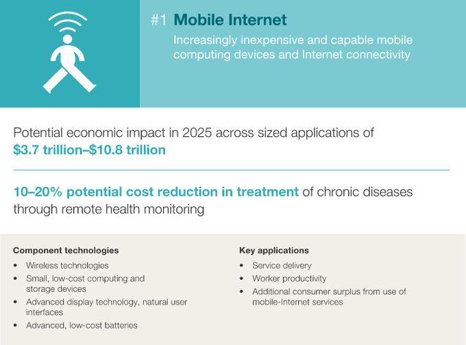 近期,麦肯锡公司发布了一项报告,里面研究了技术对未来经济的影响程度。研究的对象是一些正在取得飞速发展、具有广泛影响,且对未来经济影响显著的技术。相反,那些过于遥远的,仅能影响1、2个行业的,以及2025年之前不大可能实用化的技术,或者是虽然即将成熟但不够大众化的技术(如私人太空飞行,这在Musk看来是千年尺度的问题)等则不在考虑范围内。