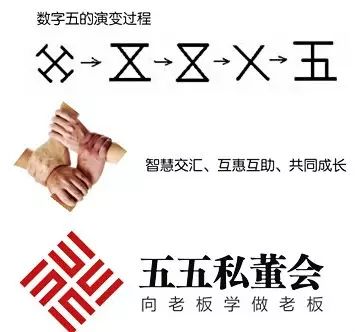 这一年,五五私董会『改标明志』重绘初心,用小篆中“五”来源于天地人的演绎过程,组合成东南西北四个朝向的图案,像四只紧握的手,象征着“智慧交汇、互惠互助、共同成长”的私董精神,这是五五的根。