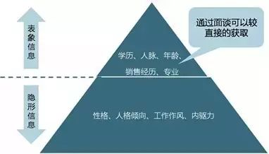 以销售人才的甄选为例,销售人才的冰山模型由冰山以上的表层信息和冰山以下的隐形信息所组成(如下图),表层信息通过面谈可以较直接的获取,隐形信息需要借助测评工具采集获取。