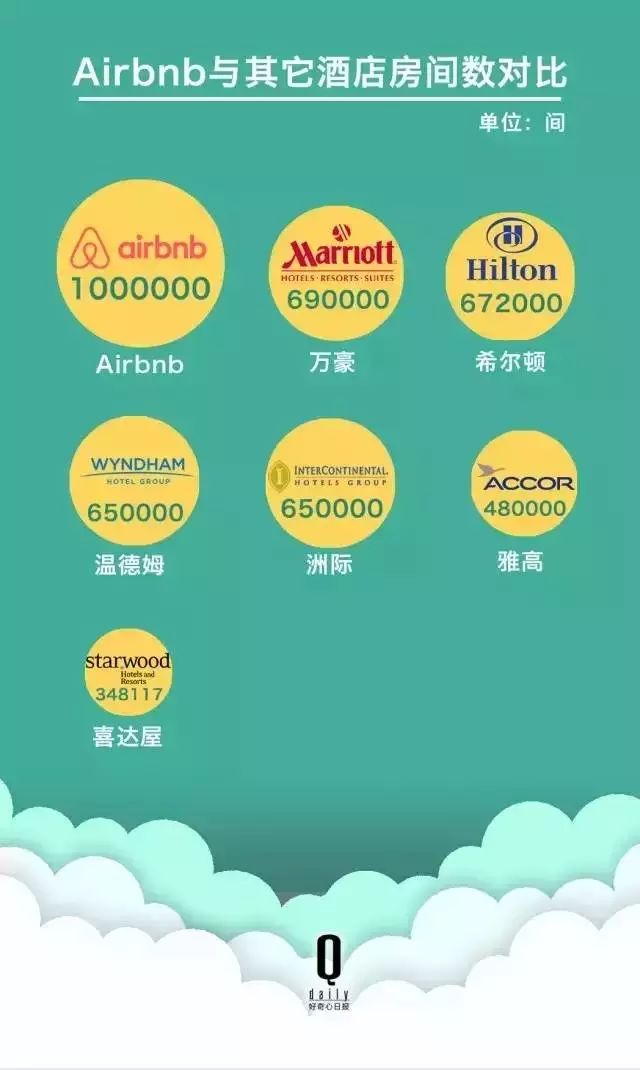 目前 Airbnb 有 1600 多名员工,共同管理着全球 190 多个国家的 100 多万个房间,与之相比,希尔顿酒店 2015 年近 16 万员工负责67万间客房,喜达屋 2014 年 18 万左右员工,负责不到 35 万间客房。