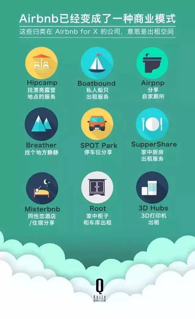 Airbnb曾经被称为“e-Bay for Space”(空间版的 e-Bay),但现在的Airbnb并不是完全指代Airbnb服务本身,它跟Uber一样,变成了一种分享经济的专商业模式的专有名词,变成了一种创业公司们参照的模板。Airbnb for X 就是他们常用的分类,初创公司的创始人们,也热衷于把自己称为“我们是XX版本的Airbnb”。
