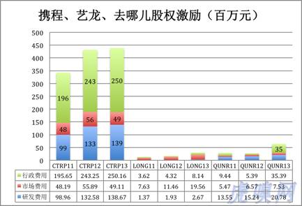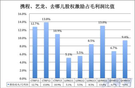 2013年,携程股权激励成本达4.38亿,是艺龙、去哪儿两家之和的4.65倍!一方面,因为携程毛利润远远高于两家竞争对手;另一方面,携程股权激励成本占毛利润的比值也不逊色于去哪儿。