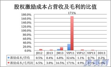 唯品会2013年突然加大对研发人员的激励,成本接近2000万元。但值得注意的是:京东股权激励的支出高峰在2012年和2013年,兑现高峰在明后两年。唯品会授予高峰在2011年,现已到达兑现高峰。