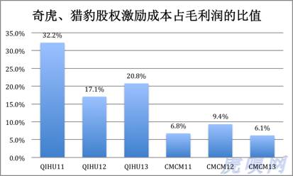 当然,这与猎豹移动规模小有一定关系。但即使从股权激励成本占毛利润的比值看,猎豹移动也“小气”得多。2013年,老周拿出毛利润的20.8%搞股权激励(2011年更是高达32.2%),猎豹只拿出毛利润的6.1%。没办法,周鸿祎是创业者兼老板,对包括自己在内的团队慷慨大方。傅盛是打工的,他自己所获期权也是聊胜于无@雷军。
