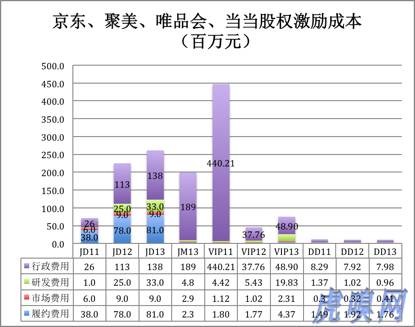 四家电商的股权激励成本都分配在行政、研发、市场及履约(即物流)这四个方面。 最引人注目的是唯品会,2011年对行政部门(即高管)的股权激励成本高达4.4亿元,2012、2013仍然保持在较高水平。其次是京东的力度也较大,也偏重于对公司高管的激励。聚美优品2011年及2012年股权激励成本微乎其微,2013年对高管的激励成本突增至1.89亿。相比之下,当当网每年成本1100万元的股权激励显得太“寒酸”了,难怪不少人觉得它缺乏活力。