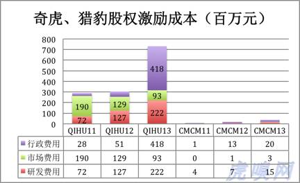 不算早年授出的低价期权,奇虎近年授出期权的执行价大多在14.5美元至31.6美元之间,上周五奇虎收盘价为91美元。可见奇虎期权含金量相当高。