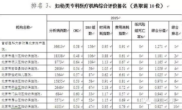 北京市的各大专科医院,也是患者集中,手术、住院类医疗服务量大的平台。2015年,北京市卫生计生委主要选取了妇幼、肿瘤、儿童、传染等4类专科医疗机构进行DRGs综合绩效评价。2015年,满足DRG评价条件的医疗机构共包括17家妇幼类专科医疗机构、3家肿瘤医院、3家儿童医院和2家传染病医院。