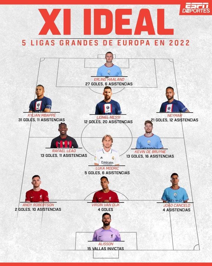 ESPN评2022最佳阵:梅西、内马尔、哈兰德、姆巴佩领衔