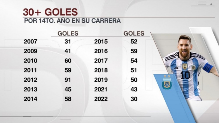 梅西2022年共计打进35球,职业生涯至今14个自然年进球30+