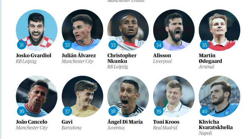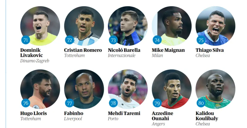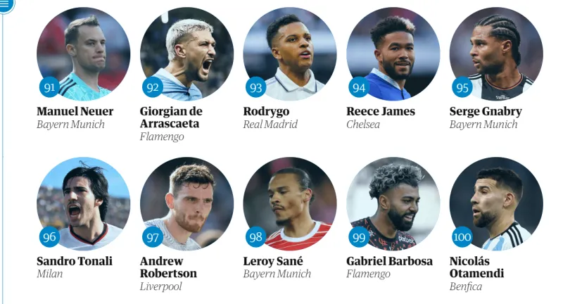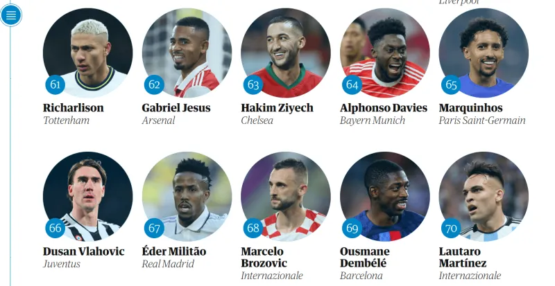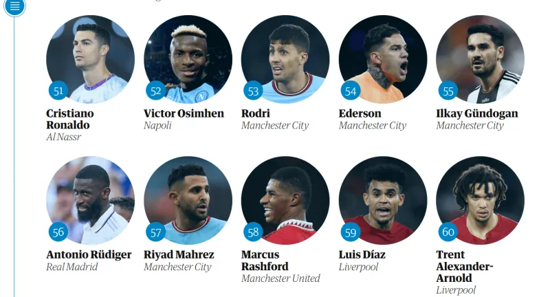 卫报2022年百大球星11-100位:马内内马尔凯恩11-13,C罗51